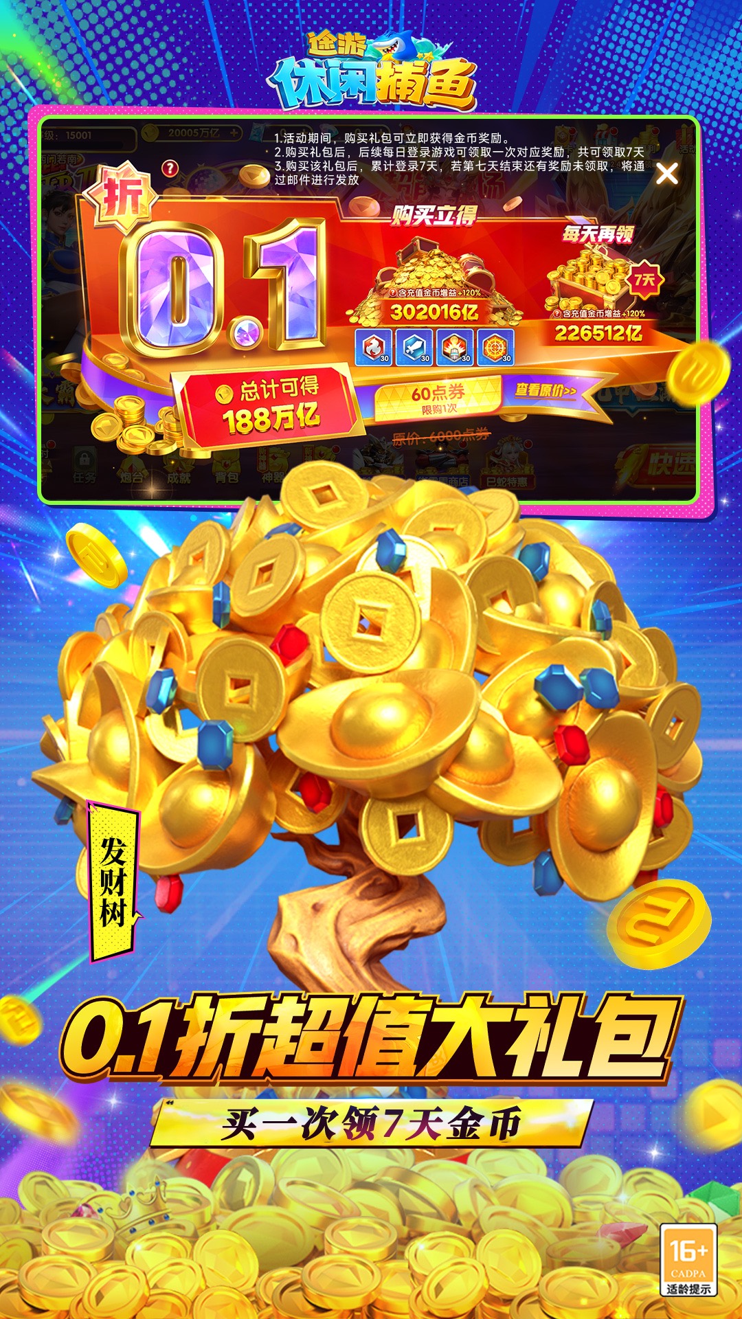 【全新礼包码】VIP666 BY888 DL666 【兑换方式】打开游戏-右上角-福利-兑换码 【新赛季渔场机甲狂潮来袭】 倍率突破赛季养成上线!开火威力大升级,超能引擎金币加成,积分兑换赢好礼,更多福利内容等你亲自来解锁! 【街霸II(Street Fighter II)官方正版联动,今日开战!】 女皇春丽降临,霸气踢翻渔场!全新联动活动登场,捕获BOSS参与抽奖,累计进度兑换大奖! 【全新引擎研发,3A画质影视级体验】 《途游休闲捕鱼》采用全新引擎打造,超强的美术表现力,复刻街机经典玩法,多个奇幻3D渔场, 捕获各种神秘强大的BOSS,炫酷的场景、超高清的画质,给您绝对震撼的视听盛宴。 【超炫3A画质】 画面华丽升级,重新定义捕鱼游戏品质。超高清3D画质,影视级视觉享受。风情万种的美人鱼、神秘尊贵的神龙太子、坐拥万金的史前巨鳄、未来科技的机械狂鲨、掌控黑暗的远古暝兽等,华丽酷炫的BOSS觉醒特效,全方位打造次世代捕鱼游戏,给您身临其境的沉浸式体验。 【捕鱼超爽体验】 全新渔场!爆率升级!倍率高!掉率高!超高的爆率,大额的金币数值,给您想不到的爽快体验。万人在线,快来称霸渔场吧! 【超全新玩法】 丰富多彩的超新玩法,神魔令、神器锻造、卡牌收集、猛兽抓捕、宝藏悬赏等多种玩法开启,丰厚惊喜,全方位体验不只是捕鱼的乐趣,精品街机捕鱼全新玩法,一起欢欢乐乐捕鱼去~ 【每日豪华福利】 每日登录领取海量惊喜,海量金币送不停。节日活动、炫酷翅膀、专属定制的炮台皮肤等多重惊喜。更有秒天秒地的激光,横冲直撞的钻头,倾尽神力的雷霆一击,毁灭一切的狂暴技能!快跟我一起来玩捕鱼吧!