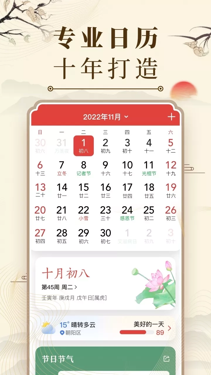 中华万年历-日历、日程、节气、天气、记事、提醒软件,功能全,体积小、速度快、口碑好,免费提供云服务,全球用户数量领先的跨平台日历APP,让时光充满乐趣! 中华万年历全新打造「语音记事」功能,5秒快速记下灵感与生活。长按语音即可启动,精准识别方言,帮你轻松记事情、记上班、记账单、记生日、纪念日等...记录重要日子,记下美好生活的大事小事, 记住人生每一个重要时刻! 1、日历:农历日历随便看,假日节气道道全。 2、天气:多维天气提醒,提供生活指数、台风降雨、空气质量、灾害预警等全方位信息; 3、记事:边说边记,精准识别 ;高效录入,智能分类;关联提醒,实时查看; 4、云同步:支持手机、Pad、网页端多终端实时同步; 5、私人定制:支持全屏半屏日历样式、多种主题皮肤。 【抱紧我们】 在线帮助:请在APP中点击「我的」-「设置」,通过「意见反馈」告诉我们。 客服电话:025-52883986(工作日09:00~18:00)