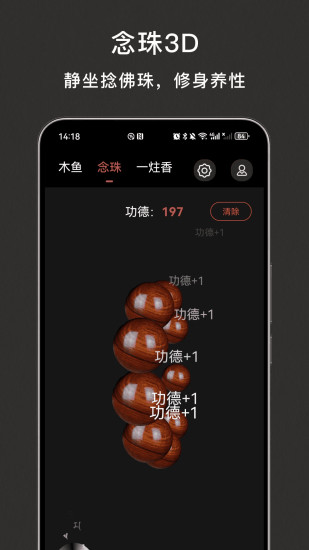 木鱼解压是一款融合电子木鱼、3D念珠、2D念珠与一炷香元素的解压应用。在这个喧嚣的世界中,我们为您提供一片宁静的天地,让您在敲击电子木鱼、拨动念珠的同时,点燃心灵的一炷香,释放压力,舒缓心情。 【电子木鱼】模拟传统木鱼的敲击声效,带您领略禅意之美。每一次敲击,都仿佛是在与心灵对话,让您在忙碌的生活中找到片刻的宁静。 【3D/2D念珠】为您提供更加丰富的修行体验。您可以模拟真实场景,拨动念珠,感受指尖的流转与心灵的沉淀。无论是3D的立体效果还是2D的简约风格,都能让您在修行中找到最适合自己的方式。 【一炷香】象征着心灵的净化与修行的虔诚。在应用中,您可以点燃一炷香,让它陪伴您度过修行的时光。随着香火的燃烧,您的内心也将逐渐平静,压力与烦恼也随之消散。 掌上木鱼应用不仅是一款解压工具,更是一个修行伴侣。它让您在喧嚣的世界中找到一片宁静的净土,让心灵得到真正的放松与滋养。无论您是在工作中感到压力山大,还是在生活中遇到烦恼困扰,都可以打开木鱼解压应用,让电子木鱼、念珠与一炷香陪伴您度过每一个修行的时刻。