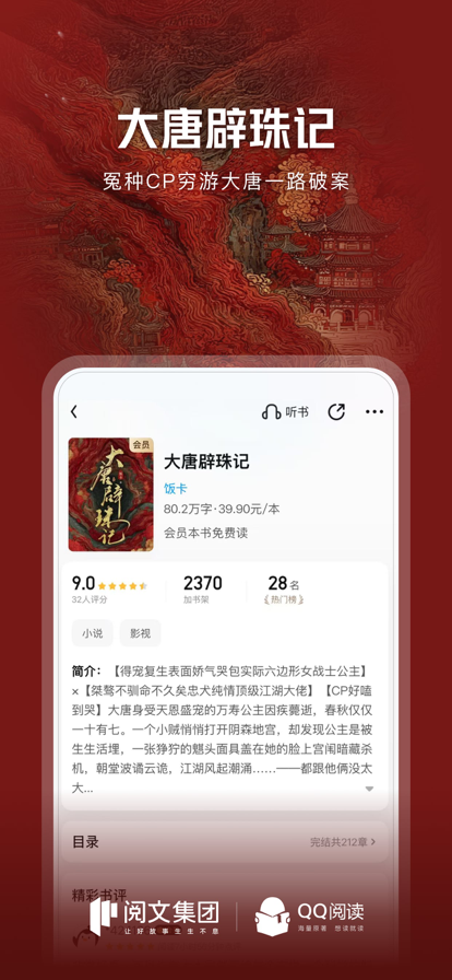 400万大神坐镇QQ阅读,为您书写全新世界;1000万册海量原著好书,尽在QQ阅读。 【热门内容】 《桃花源没事儿》:继《长安的荔枝》《太白金星有点烦》后,马伯庸将历史脑洞进行到底,用最小切口呈现最精妙的历史想象力。 《你已生活在未来》:宝树2025新作。AI、元字宙、虚拟现实、基因编辑,那些“可能的明天”,成为“正在发生的今天”。 《大唐辟珠记》:饭卡架空历史小说,悬疑+甜宠,CP绝配!逃地宫缺钱粮,一路破案赚盘缠,大唐冤种旅行团爆笑上路。 《公路求生,我的房车是移动别墅》:虞姜突然进入公路求生游戏,开局四个选项,她果断选择三蹦子。没想到,她很快就位列游戏富豪榜第一,三蹦子也变成了堪比移动别墅的豪华房车。 《高考改志愿后,高冷竹马他急红眼》:上一世,许意欢和周宴泽约定好去南大,于是放弃了保送资格,最终却落得一个高考零分的下场。直到死后她才知道,原来是有人绑定了换分系统。 《潜修十五年,开局一品绝巅!》:李慕生穿越过来十五年,却被大黎朝密探找上门。他这才得知自己的真实身份,乃是大黎皇朝被人阴谋偷换遗失的皇子…… 《斗罗:武魂蓝银草,我能起死回生》:穿越斗罗只觉醒出了蓝银草武魂,然而唐川选择的却是一条截然不同的修炼道路。他的蓝银草不走控制系,而是生命系! 【产品特性】 -海量精品书:海量优质内容每日更新,总有一款适合你; -福利大放送:阅读时长兑换、等级礼包、漫画礼包、听书礼包、会员礼包,一站领取; -个性化推荐:每日推荐好书,QQ阅读更懂您的口味; -图书排行榜:十年经典、完结好书,排行榜告诉您当下最火书籍; -书籍精排版:图文并茂的电子书,不一样的阅读体验; -来听有声书:看累了?听书帮您解放双眼,用耳朵聆听世界; -漫画随意看:你看书我买单,漫画壕礼送不停; -同人聚集地:斗罗、斗破等热门IP,衍生作品看不停! 【自动续费】 注意事项: 1、服务名称:QQ阅读会员自动续费。 2、本服务是在您已开通QQ阅读会员服务的前提下,为您提供的自动续费服务。如您开通QQ阅读会员服务,则视为您授权QQ阅读有权在您的QQ阅读会员服务即将到期时,从您的自有充值账户、与会员账号绑定的iTunes账户(以下统称“账户”)余额中代扣下一个计费周期会员费。该服务实现的前提是您已将QQ阅读会员账号与上述账户绑定,且可成功从上述账户中扣款,因上述账户中可扣款余额不足导致的续费失败,由您自行承担。 QQ阅读会员服务有四种订购方式可供选择: 第一种:18元/1个月,每1个月自动续订。 第二种:25元/1个月。 第三种:198元/12个月。 第四种:60元/3个月。 3、购买1个月且自动续费的QQ阅读会员服务的账号,会在到期前24小时,自动续订并扣除相应费用。 4、如需取消自动续订,请至少提前24小时操作取消。您可通过下述方式中止或终止本服务: 苹果应用内支付(IAP支付,in-app purchase)自动续费用户退订方法如下: 打开苹果手机“设置” --> 进入“iTunes Store 与 App Store”-->点击 “Apple ID”,选择"查看Apple ID",进入"账户设置"页面,点击“订阅”,选择QQ阅读包月服务取消订阅即可。 同一个appleid只能给一个QQ号码开通自动续费服务。 更多详细内容可查阅: 《QQ阅读软件许可及服务协议》: https://yuedu.reader.qq.com/h5/about/lawAgreement?agreementId=28 《QQ阅读用户个人信息保护及隐私政策协议》: https://ih5.reader.qq.com/h5/about/lawAgreement?agreementId=131 《QQ阅读付费服务及充值规则协议》: https://yuedu.reader.qq.com/h5/about/lawAgreement?agreementId=29 【特别声明】 -在《QQ阅读》中,用户使用平台账号(QQ号)登录,能够同步本应用中部分数据。用户在该应用中购买的代币“阅币”仅限于在此应用中使用。腾讯平台上的虚拟货币, 比如Q币、Q点等都无法在本应用内使用。 -本软件的内容和QQ书城或任何其他QQ电子书支付的服务无关。在软件中,用户无法使用以前在QQ书城或在其他QQ电子书服务使用QQ币购买的任何内容。 -本软件的微信账户与QQ账户信息互不相通。 【联系我们】 -在线客服:QQ阅读->我的->帮助中心->联系客服