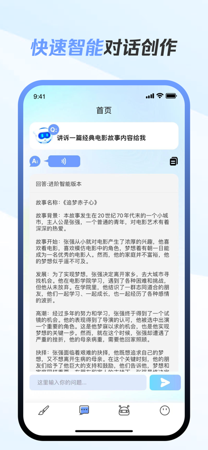 这是一款高效的人工智能创意创作问答工具。为您工作、生活创作提供有用的建议和高效的创意灵感。 基于丰富的知识积累,我们能为您提供有用的参考内容,协助您快速的获得建设性的答案。 它还能为您提供灵感来源。从工作、生活、创作等多个场景中,通过聊天提问的方式,提升创作效率,激发您的创造力和想象力。 个性定制,通过您预期的偏好,并根据您的互动反馈提供个性化的解决方案。 便捷的使用体验,它简洁直观的界面,无需繁琐的学习过程,轻松快速上手使用。你可以随时向它提问,它都会随时与您互动,成为您的灵感创作助手,为您的高效创作提供便 利。 人工智能与您一同探索浩瀚的知识创意空间! - 付款:用户确认购买并付款后记入 iTunes 账户。 - 取消续订:如需取消续订,请在当前订阅到期 24 小时以前,手动在iTunes/Apple ID 设置管理中关闭自动续订功能。 - 续订:苹果 iTunes 账户会在到期前 24 小时内扣款,扣款成功后订阅周期顺延相应期限。 免责声明:请不要输入个人隐私信息,可能会产生不准确或冒犯性的内容,AI模型发出的信息是由计算机生成,可能是虚构的,请您自行辨别是非,本应用对生成的内容不承担任何责任;您在使用本应用咨询医疗问题时,本应用仅提供医疗建议,不代表医疗服务或治疗。用户在使用本应用前必须咨询医生,对医疗决定负最终责任。本应用的信息及服务应仅供参考,不构成建议和治疗方式,我们不承担由使用本应用而产生的任何责任。 隐私政策:https://cb3i458lt6.feishu.cn/docx/A9N8dnUACoZZGBxsAx9cKeqBnJg 用户协议:https://cb3i458lt6.feishu.cn/docx/MGXJdJJqjoomD2xiDltcTDq0nOc 包月服务:https://cb3i458lt6.feishu.cn/docx/PWkndFTfRokGbAxPu8ncp5ixnib 联系邮箱:yds2023915@163.com