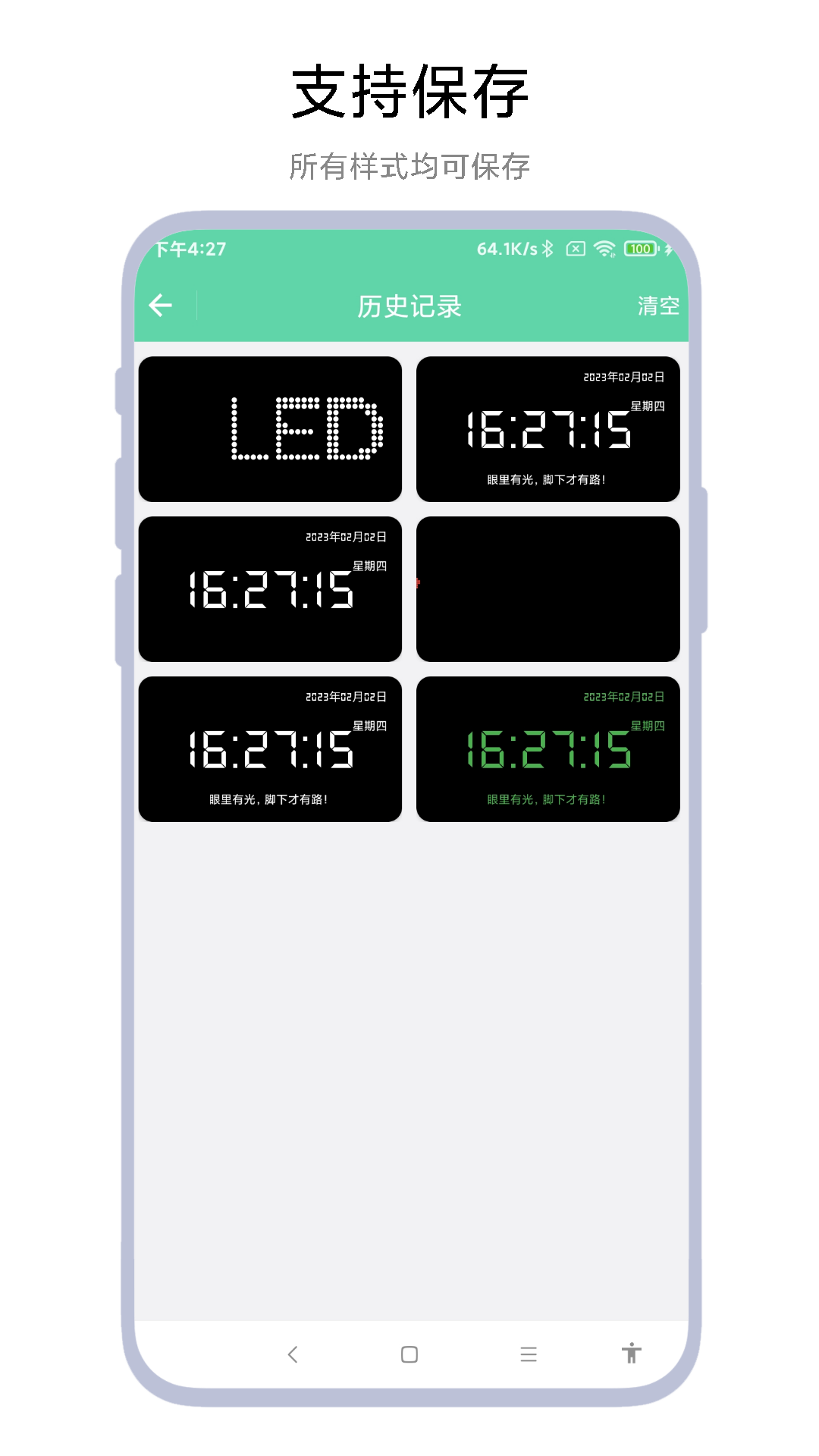 会说话能保存的滚动字幕,爱要大声说出来!绚丽的应援打Call神器!<br>● LED显示屏,LED跑马灯,大字幕,滚动字幕,跑马灯屏,支持多种颜色、方向、速度、背景特效、音效等选择。<br>● 手持弹幕LED,追星应援神器。<br>● 绚丽的文字灯牌,商家宣传醒目提示。<br>● 低能耗电子时间、时钟显示。<br>● 小夜灯、手电筒照明。