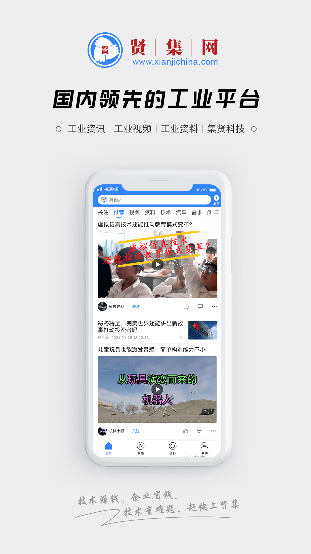 贤集懂你的工业技术的自媒体平台,新技术、新产品、新机会、新项目、找资料、找图纸<br><br>贤集APP功能:工业资讯、行业技术新闻、产品研发信息头条、产品交易分析等。随时随地获取工业新闻资讯.一键参与,分享热门工作技术活动经验.<br><br>贤集网直接对接100个产业带、数万家工厂,数十万工业技术人才,数百万工业行业人群覆盖,专注工业用品十多年的行业经验,致力于提供高质量、性价比产品 ,满足客户一站式工业品新闻资讯。覆盖机械自动化、电气工控、五金工具、测量仪器仪表、金属加工、润滑剂、紧固件、化学品等<br><br>机械:工程机械一站式综合服务平台,海量设备信息免费查询、发布。真实、高效、免费,用心服务,让您省钱、省心。<br><br>电气:提供丰富的电工资料,辅助学习电学基础知识、电工工具、家庭电路等,电气工程师的移动资料库。<br><br>【发布微头条】<br>创作者可以发布工作事情,工作问题,工作看法,工作经验,工作体验等发布工业原创微头条、小视频、工业资料等。<br><br>《视频》<br>工业视频、科普视频、技术视频汇总,汇聚全网数万商业、设计、科普的知名KOL,严选深度视频。让你轻松获得一个新知识,阐述一种新见解,领会一种新思想。从技术人、企业家、教授、工人、行业专家的视角之中,你将有机会高屋建瓴地俯视你的工作和生活,这将对你的人生大有裨益。<br><br>《资料》<br>技术资料汇总,包含各行业图纸、教程、文档、经验、软件等技术资料。新技术、新产品、新机会、新项目、找资料、找图纸。<br><br>《成果》<br>科技成果转化、技术成果转让、科研成果转化,汇集科研成果、技术成果、科技成果、专利技术、技术方案,线上快速匹配、供需双方高效对接、推动技术成果落地。致力于向创投界、企业界、技术界提供代表中国最高最精尖的高校学府视野之科技成果,精准匹配、热点推送,目标在于推动高校科技成果转化。<br><br>《需求》<br>企业技术需求无论是大学生课余时间、工作党周末休息时光、宝妈的空闲之余都可以在这里找到最为优质合适的兼职。全行业服务品类覆盖,可满足公司初创期、成长期、成熟期等各发展阶段的各类专业服务需求。<br><br>官网:www.xianjichina.com<br>电话:400-615-8109