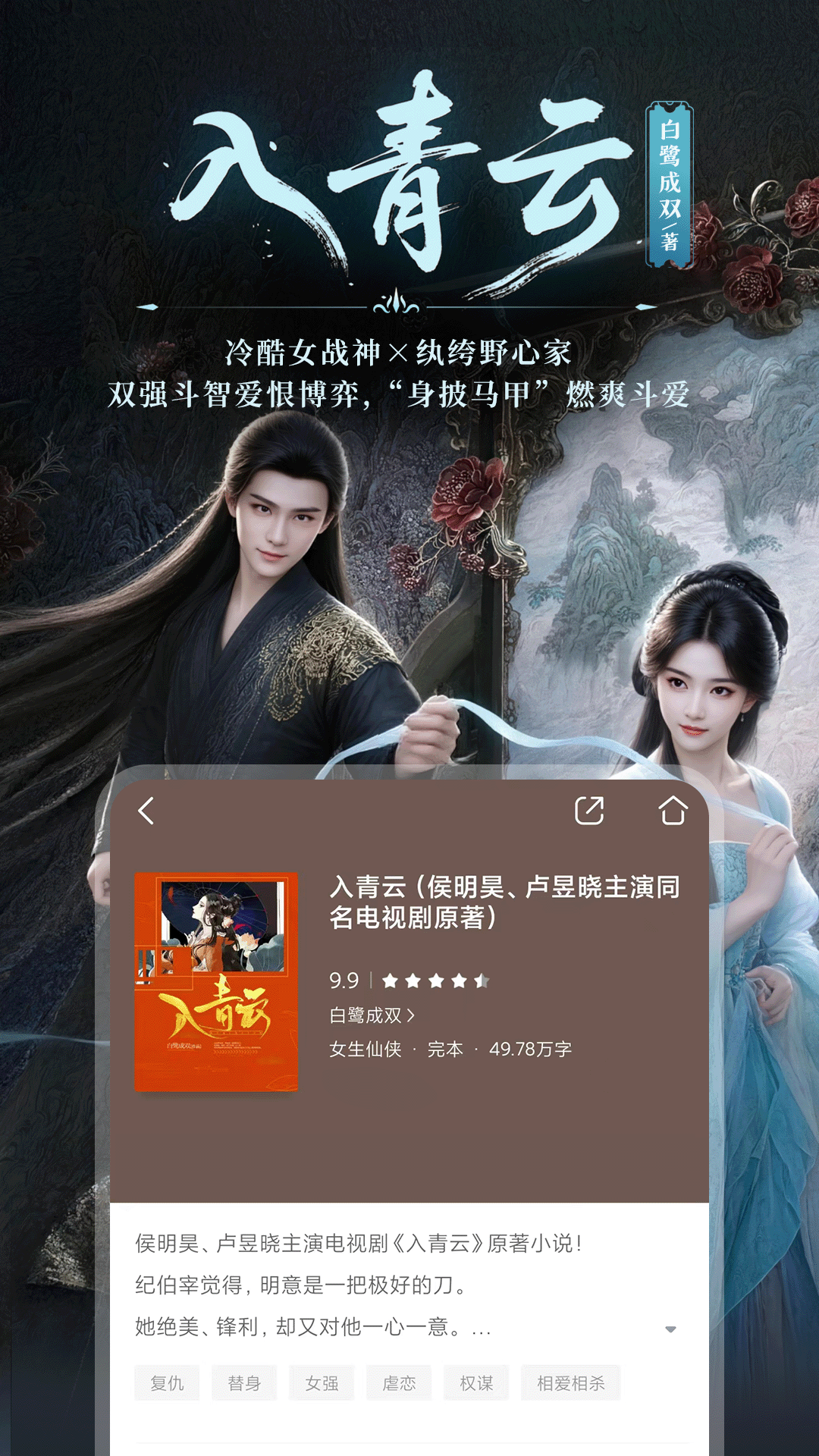 锦月如歌、生万物、凡人修仙传、国色芳华、淬火年代长安的荔枝、折腰、我叫赵甲第、借命而生、雁回时等经典原著。 万仙来朝、万剑朝宗、牛奶可乐经济学4、燃烧的蜂鸟.时空追凶1990、血孩子、保护我方族长、第一天骄、清朝生活实录等热门网文出版图书。 【热播影视】 《千劫眉》:罗云熙主演《水龙吟》原著,藤萍武侠经典!群侠林立搅动江湖,龙吟出鞘书写神州传奇! 《大乔小乔》:赵露思、陈伟霆主演《许我耀眼》原著,表面光鲜的婚姻下隐藏着谎言与操控?一场关于爱与自我的耀眼重生! 《飓风行动之围猎》:王阳、俞灏明主演《围猎》原著,毒祸人间,英雄逆行,市井藏锋,誓斩毒根!破毒局迷阵,擒幕后黑手! 《入青云》:侯明昊、卢昱晓上演燃爽斗爱。冷酷女战神遇上纨绔野心家,“身披马甲”双强博弈,这场互钓游戏,谁先坠入爱河? 《与晋长安》:宋轶、丞磊主演同名电视剧原著,九鹭非香古言力作!飒爽女将军vs 三重身份敌国皇子,宿敌虐恋,三重燃爱! 【霸榜好书】 《洪荒:开局杀了申公豹》:重生洪荒,我竟是一条小蛇?激激活无敌选择系统,统御万劫,吾便是洪荒天道! 《有帝族背景还开挂,我无敌了!》:开局觉醒混沌体,我摊牌了!比背景,我爹妈是帝族;比开挂,我专治各种不服! 《拓扑与物理》杨振宁与11位科学巨匠联袂执笔,从鞋带、中国结到黑洞、拓扑绝缘体,用生活化的比喻揭开诺贝尔奖最关注的前沿物理真相——拓扑。 《便携式桃源》:种瓜得仙草,养鸡变凤凰!骗子乞丐给的破画竟是桃源金钥匙?这波操作直接开启种田修仙暴富路! 《不朽神魔诀》:少年九死一生,觉醒逆天血脉!手持血纹枪,脚踏无敌路,枪道千万里谁敢称尊! 《焦虑的一代:如何养育手机里泡大的孩子?》:我们无法将孩子与数字世界隔离,但可以教会他们如何与之共处。 【精彩短剧】 《荣耀天尊》 《金鳞破局掌商海》 《山河依旧满春风》《江晚自有舟渡》《重生八零:情定地平线》《坠入他的一往情深》《巨鲨风暴》《夺玉》《父如高楼》 【产品功能亮点】 -海量书库-超60万册正版图书,百万小时听书 -精彩短剧-热门爆款短剧任意看。 【福利活动中心】 读书会员、影视热门图书,福利送不停! 【新人福利】新用户海量内容免费看~ 【分类齐全】玄幻、奇幻、科幻、言情、仙侠、都市、出版、历史、悬疑推理、青春校园、女生同人等等~