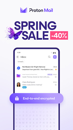 Proton Mail's all-new encrypted email app protects your communications and has everything you need to easily manage your inbox.<br><br>The Wall Street Journal says:<br>“Proton Mail offers encrypted email, which makes it virtually impossible for anyone to read it except the sender and the recipient.” <br><br>With the all-new Proton Mail app, you can:<br>• Create a @proton.me or @protonmail.com email address <br>• Send and receive encrypted emails and attachments with ease<br>• Switch between multiple Proton Mail accounts<br>• Keep your inbox tidy and clean with folders, labels and simple swipe-gestures<br>• Receive new email notifications<br>• Send Password-protected Emails to anyone<br>• Enjoy your inbox in dark mode<br><br>Why use Proton Mail?<br>• Proton Mail is free — We believe everyone deserves privacy. Upgrade to a paid plan to get more done and support our mission. <br>• Easy to use — Our all-new app has been redesigned to make it easier to read, organize, and write your emails. <br>• Your inbox is yours — We don’t spy on your communications to show you targeted ads. Your inbox, your rules.<br>• Rigorous encryption — Your inbox is secured on all your devices. No one can read your emails but you. Proton is privacy, guaranteed by end-to-end and zero-access encryption.<br>• Unmatched protection — We offer strong phishing, spam, and spying/tracking protection.<br><br>Industry Leading Security Features<br>Messages are stored on Proton Mail servers using end-to-end encryption at all times and are transmitted securely between Proton servers and user devices. This largely eliminates the risk of message interception.<br><br>Zero Access to Your Email Content<br>Proton Mail's zero access architecture means that your data is encrypted in a way that makes it inaccessible to us. Data is encrypted on the client side using an encryption key that Proton does not have access to. This means we don't have the technical ability to decrypt your messages.<br><br>Open-Source Cryptography<br>Proton Mail's open-source software has been thoroughly vetted by security experts from around the world to ensure the highest levels of protection. Proton Mail only uses secure implementations of AES, RSA, along with OpenPGP, while all of the cryptographic libraries used are open source. By using open-source libraries, Proton Mail can guarantee that the encryption algorithms used do not have clandestinely built-in back doors. <br><br>Proton Easy Switch<br>Migrate from Gmail, Outlook, Yahoo, iCloud Mail or AOL to Proton Mail in just a few taps. Your messages, calendars and contacts are transferred automatically, so you’re up‑and‑running in moments—without any manual exporting or importing.<br><br>Gmail Auto‑forwarding<br>Enable auto‑forwarding from any number of Gmail accounts and funnel all the emails that matter into your Proton Mail inbox. Preserve Gmail’s convenience while adding an extra layer of privacy protection.<br><br>Proton Mail in the press:<br><br>“Proton Mail is an email system which uses end-to-end encryption, making it impossible for outside parties to monitor.” Forbes<br><br>“A new email service being developed by a group from MIT that met at CERN promises to bring secure, encrypted email to the masses and keep sensitive information away from prying eyes.” Huffington Post<br><br>Follow Proton on social media for all the latest news and offers:<br>Facebook: /proton<br>Twitter: @protonprivacy<br>Reddit: /protonmail<br>Instagram: /protonprivacy<br><br>For more information, visit: https://proton.me/mail<br>Our open-source code base: https://github.com/ProtonMail