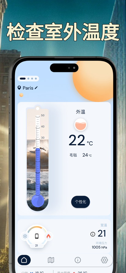 室内温度计 可手动录入温度,记录每一次温度测量记录。 监测您所在的地区室内户外的实时温度、为您提供实时天气的温度,让您随时随地了解当前天气状况。 还有手机降温功能防止手机发烫。