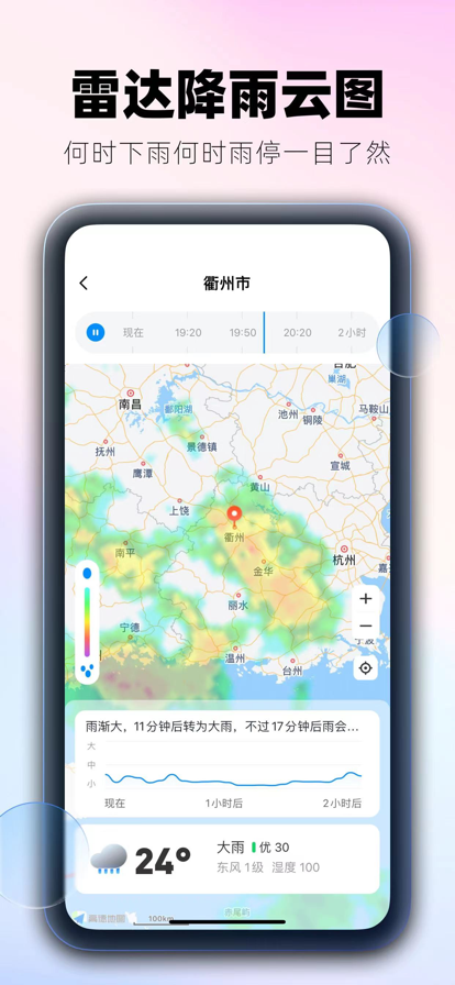 全面、准确、实用的天气预报信息,是您日常生活中可靠的天气预报伙伴,让您的生活更加有序、便捷和安心。 【实时天气查询】根据您当前所处或选择的位置获取天气预报信息,无论是晴天、雨天还是其他天气状况,都能让您对当下的实况天气一目了然,随时知晓周边环境状况。 【2小时降水预报】所提供的分钟级降雨降雪数据,可以预测具体在几点几分会下雨或下雪,让您轻松查阅到未来2 小时的天气具体变化情况,方便您掌握天气变化动态,让您的出行安排尽在掌握。 【15日天气预报】全面涵盖了未来 15 日的天气详情,包括降雨、风向、温度、湿度以及空气质量预报等丰富多样的信息,助您提前做好长远的规划与安排,无论是工作、生活还是旅行,都能提前做好充分准备。 【生活指数】包括了如空气质量、穿衣建议、感冒指数等众多实用的生活指数,为您的日常生活提供全方位的贴心指导和建议。还有气压、湿度、能见度等关键信息对于热爱户外钓鱼的人士来说,是不可多得的好帮手。