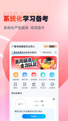 播音主持人考试聚题库:备考路上的“声”动指南 还在为播音主持考试抓耳挠腮?普通话绕口令总卡壳?即兴评述大脑一片空白?别慌!这款专为播音考生打造的“宝藏题库”,就是你的备考“救星”! “声”临其境练核心 题库紧扣考试大纲,语音发声、新闻播报、即兴评述……所有核心模块全覆盖!每道题都像考官亲自出题,练完直接“开挂”上考场。 错题本?你的“私人教练” 练错题自动归档,薄弱环节一目了然。反复刷错题,就像给知识“打补丁”,考前再也不怕“知识漏洞”突然袭击! 模拟考:考场“预演”神器 计时答题、评分反馈,还原真实考场压力。练多了,考试当天就像“回家”,紧张?不存在的! 界面清爽,备考不“烧脑” 按章节、难度分类,想练啥点啥。自定义学习计划,进度条清晰可见,备考就像打游戏,升级通关超有成就感! 更新不停,备考不“掉队” 新题、解析定期补充,紧跟考试风向。播音小白还是老手,都能找到“专属战场”。 还在等什么?下载它,让备考从“煎熬”变“享受”,下一个“金牌主持人”就是你!