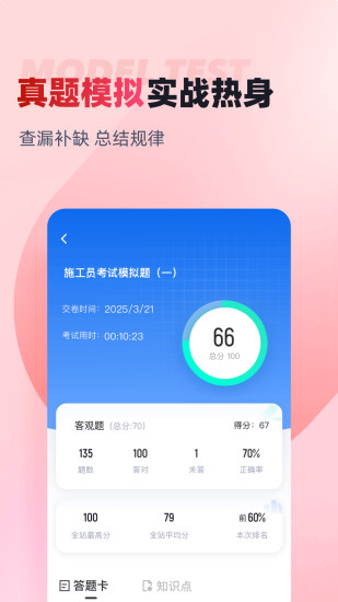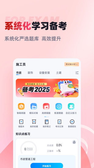 施工员考试聚题库—— 精准聚焦考点 助力高效取证 备战施工员岗位资格考试?施工员考试聚题库是您专业可靠的备考伙伴。我们提供权威、精准的练习资源,助您系统掌握建筑工程施工技术与管理核心知识,从容应对考试挑战。 真题模拟实战演练 应用内精选汇集海量历年真题及高仿真模拟试卷,严格依据最新施工员考试大纲与命题规律精心编写。通过模拟考试功能,您可体验真实考场氛围与时间压力,进行全真限时测试。考试结束后,系统即时智能评分并生成详尽分析报告,报告精准定位您的知识薄弱环节,帮助您明确后续复习重点与提升策略。 系统化知识点分类精练 告别无重点的泛泛而学。我们依据施工员考试的核心要求,将庞杂的建筑工程知识体系科学分类为清晰的知识点模块。您可以针对个人知识短板或重点难点,进行精准高效的专项练习,快速巩固理论基础,透彻理解施工规范、技术原理与管理要点。 施工员考试聚题库集权威真题模拟与系统知识点精练于一体,设计科学,操作便捷。通过反复的实战演练与针对性的知识强化,帮助您深度梳理,有效提升解题速度、应试水平与岗位胜任力。是您系统复习、查漏补缺、提升考试通过率、迈向施工管理岗位的专业助手。