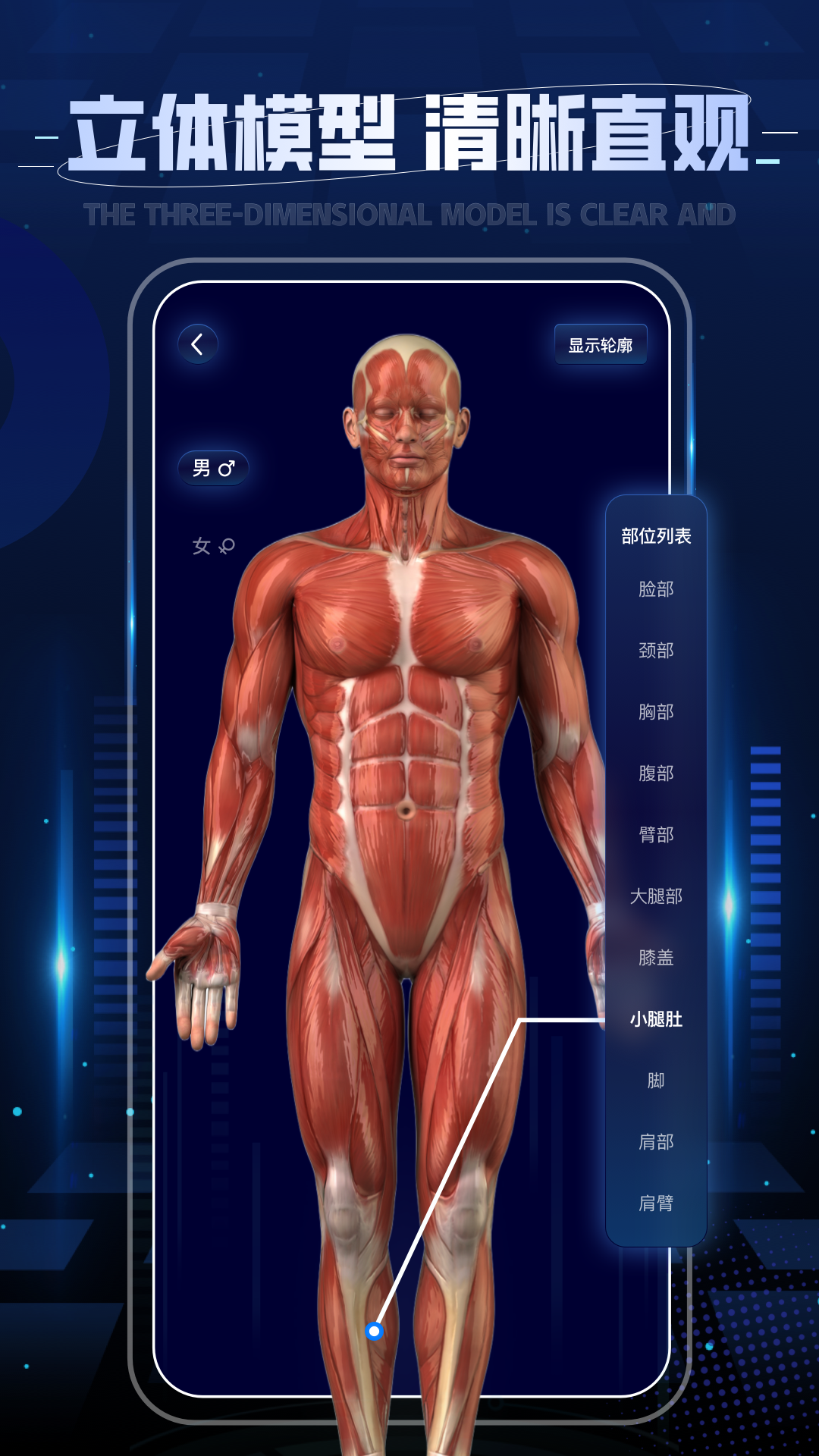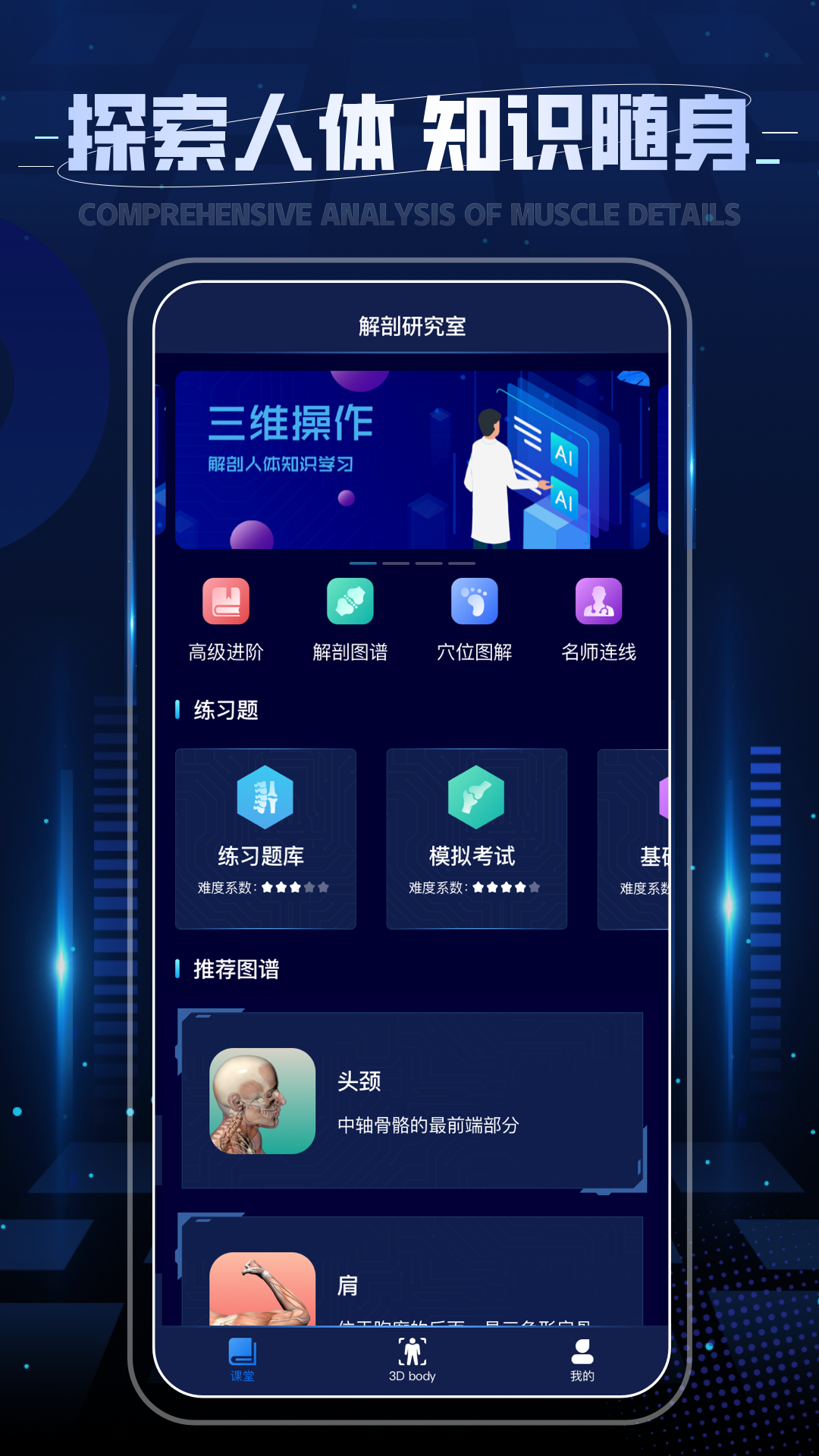 解剖大师APP是一款专为医学学习者、运动健康领域从业者及医疗康复从业者深度研发的3D解剖医学资源平台。依托Unity引擎的高精度建模与动态可视化技术,将人体正常解剖结构、运动功能解剖、异常体态表现及运动康复机制以3D模型形式直观呈现,深度整合学习资源库、患教工具、治疗方案、智能化评估及多终端适配能力,打造覆盖“学-教-治”全链路的医学学习与临床实践学习平台。<br>特色内容<br>● 全人体解剖资源:覆盖宏观(骨骼/肌肉)到微观(细胞/纤维)的人体结构,含15000+解剖结构及微观模型。<br>● 多维度交互操作:支持隐藏、透明、拆分、切割等灵活操作,自行编辑解剖图谱与学习笔记。<br>● 临床级解剖模型:高清精细局部解剖模型,高度还原真实人体细节,无缝衔接理论学习与临床实践。<br>● 微观结构可视化:提供细胞胞体、肺泡、肌肉纤维等微观3D模型,突破教材限制,辅助理解人体结构。<br>● 运动科学全覆盖:整合关节动作动画、瑜伽200+体式库、健身100+动作库,满足运动分析到原理解析的全链路需求。<br>● 智能体态评估:上传照片立即生成16项体态数据报告,支持数据对比与客户建档,为康复/矫正提供量化依据。<br>● 病理动态模拟:自由调整脊柱各段角度,模拟颈椎病、腰椎侧弯等病理状态,向患者直观展示。<br>● 康复动作可视化:收录百余个康复动作3D模型,规范患者跟练与治疗师教学,保障动作安全性。<br>● 触发点精准定位:3D定位肌肉触发点(激痛点),结合疼痛放射路径与神经支配区域,辅助快速制定靶向疼痛干预方案。<br>● 解剖融合经络穴位:解剖学与针灸学深度结合,帮助学习者理解穴位的解剖学位置与针刺风险,提升进针准确性与安全性。<br><br>功能介绍<br>一、人体解剖:从宏观到微观的全维度解剖资源库<br>● 3D人体解剖:提供男女性整体人3D模型,涵盖骨骼、肌肉、神经、血管等15000+解剖结构,支持隐藏、透明、拆分、切割等多维度操作。无论是医学生的系统性结构认知,还是运动健身康复从业者的基础解剖学习,均可通过灵活交互快速掌握人体整体架构与细节关联。<br>● 临床解剖:持续更新的高清精细局部解剖模型,紧密贴合临床诊疗需求。从头颈部到四肢关节,从浅层组织到深层结构,模型细节高度还原真实人体,助力医疗从业者实现从理论学习到临床实践的无缝衔接。<br>● 微观解剖:聚焦细胞级解剖学习,提供3D细胞胞体、肺泡、骨构造、肌肉纤维等微观结构模型。