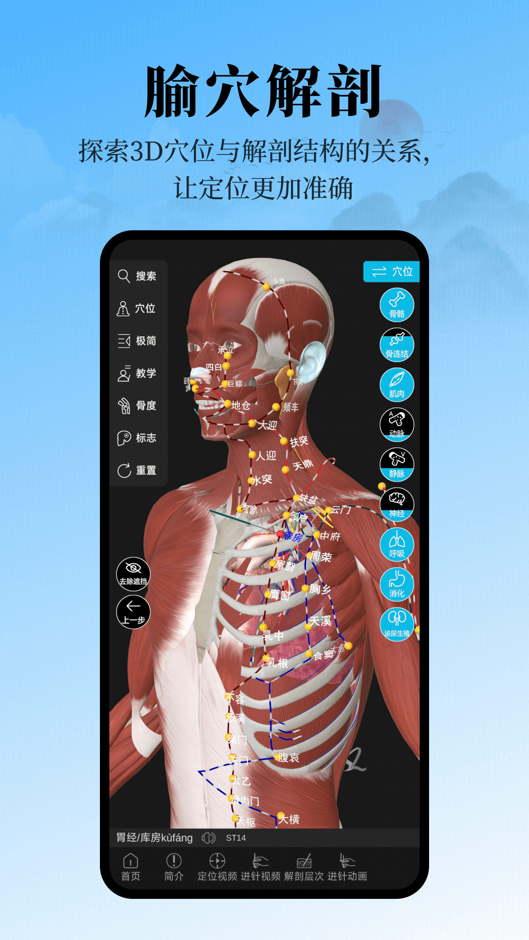 针灸大师(Acupuncture master 2025)将经络穴位与人体精细解剖相结合,是交互式学习十二经脉,奇经八脉,经络系统,耳穴,手足反射区,董氏奇穴等的3D针灸学习软件。提供全身每个穴位的进针深度和角度,穴位周围结构解剖,定位进针视频和腧穴剖面图谱,穴位定位练习,模拟针刺练习,病症查询,辩证配穴等3D学习资源.是中医从业者,医学生,健康养生理疗,针灸研究,推拿按摩,艾灸拔罐,中医科普工作者研究和学习针灸的得力搭档. 特色功能: 【时间针法选穴】传承中医因时制宜的治疗理念,帮助针灸施针者依据时间选取穴位,更好地激发经气,调节人体脏腑经络功能。 【穴位动画切割】通过三维模型切割技术,展现穴位针刺断面,了解进针路径的解剖层次 【取穴进针视频】收录大量临床针灸医生的定位,进针视频供学习者参考学习 【全身腧穴解剖】一键切换穴位解剖模式,查看穴位周围骨骼肌肉血管神经等结构 【虚拟针刺练习】模拟取穴进针过程,进行安全无害的针刺操作和练习,掌握进针要点 【穴位定位练习】提供骨度分寸,体表标志,解剖结构进行穴位定位训练,帮助学习者掌握穴位位置 【经络循行描画】通过3D画笔反复描绘经络循行路径,高效记忆经络走行 【经络动态循行】3D动态流动的经络表里循行,明显区分了阴经和阳经 【人体经穴大全】十二经络,奇经八脉,经外奇穴,耳穴,董氏奇穴的知识体系尽收其中,掌上中医穴位百科大全 【董氏奇穴资源】首家研发了董氏奇穴3D模型,提供穴位定位,主治,解剖等详细资料 【人体反射区】符合国家标准的耳穴穴位,耳部结构,手足反射区,手反射点3D模型,提供丰富的学习资源 免费3D经络:免费研究和学习人体经络,详细的经络简介,歌诀,主治,对应病症等资源 完整的经穴体系:包含十二经络,奇经八脉,十五络脉,十二经别,十二经筋,十二皮部.每条经脉提供了简介,内外循行,黄帝内经,主要病症,主治概要,经络循行歌诀,穴位歌诀 丰富的经络穴位:包含十二经脉穴位,奇经八脉穴位,经外奇穴,所有特定穴如:五输穴,八会穴,八脉交会穴,背俞穴等,和董氏奇穴,耳穴(包括耳廓分区,耳穴定位,耳朵的结构),手足反射区,手反射点等 腧穴解剖:包含多层次显示的骨骼,肌肉,动静脉,神经,呼吸,消化,泌尿,生殖系统等等人体解剖结构,模型4K高清不失真 找穴位:按照身体部位查找穴位,快速定位,适合零基础针灸学习者快速找穴 查疾病:集成了大量疾病介绍与针灸治疗方案,方便了解每个常见疾病的介绍,辩证,治法,主穴,配穴,方义和操作,帮助学习者在临床上快速上手 看视频:开放丰富的免费经络穴位视频资源,三维模型结合名师讲解,入门学习更简单更系统 针灸大师学习更方便! 相比于传统的针灸图谱,针灸铜人和针灸图书,它有3个优势: 1,比针灸图谱和实体针灸模型,价格更优惠,更方便携带.您可以利用碎片时间学习中医针灸. 2,支持放大缩小,旋转平移,透明隐藏等操作,趣味学习针灸学. 3,在经络腧穴的基础上,支持查看精细的骨骼,神经,动静脉,淋巴,肌肉等解剖结构,对于临床使用的重要穴位,提供了定位和进针示范视频. 4,创新发布针刺练习功能,在3D数字人身上练习针刺的准确性; 5,精准定位模拟练习,看老中医操作,虚拟模型定位练习,腧穴解剖研究,让您成为针灸达人; 软件适用对象 无论是医学生,医生等专业人士还是针灸爱好者,都能从该软件获得帮助. 1,中医养生爱好者:可参考穴位说明,为自己和家人养生保养.通过对穴位的正确刺激,例如拔罐,刮痧,按摩,艾灸等方式达到强身健体,保健养生的作用.