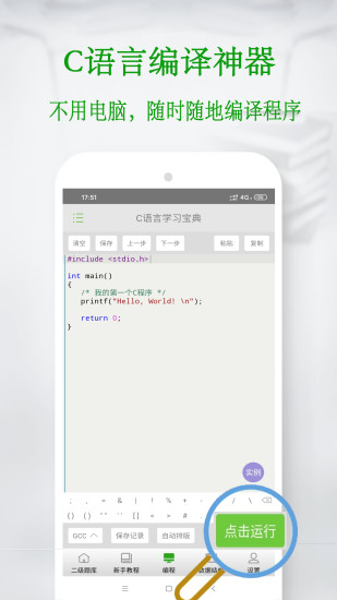 计算机二级和C语言编译器是本软件主打内容,让您一起学学习通C语言学习各阶段知识。软件首页就是C语言编译器计,第二页就是计算机二级C语言题库,堪称计算机二级宝典。 C语言编译器是一款帮助C语言编程爱好者、学生和从业者学习C语言的工具,包含海量新手经典项目案例源代码,在线C语言编译器,语法高亮,多款主题,极速编译,以及新手入门教材及课件,学习资料,建模算法等功能和内容。计算机二级C语言题库,全国计算机二级等级考试题库!真题题库,实时更新,二级必备练题软件!考点汇总整理,选择权威解析,操作真题步骤,零基础无压力通关。二级考试真正的通关必备宝典! 【C语言编译器】 本地编译,无需网络,提供多种编译器内核和编译控制台,让没有计算机的同学们也能随时随地运行C语言小程序。 【c教程】 1.章节层次鲜明,重点突出,强调基础知识,C语言二级考试轻松过。 2.章节知识与习题配套,每一题都有名师详细讲解,你还用担心有什么不懂的吗? 3.内容丰富,针对性强,对学者们知识薄弱处重点讲解。 4 数据结构和算法详细讲解 5 公共基础知识学习 无论您是在校大学生,还是职业学员,或者其他开发人员,本软件都志在全面提高您的C语言编程思想和开发实力,使您能够系统的学习C语言,写出高质量的代码,相信本软件的使用能使您获益匪浅。