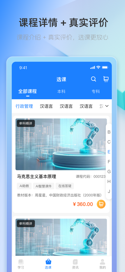 ——【产品特色】—— 包含自考本科、成人高考、专升本多项考试类目; 覆盖专业:行政管理、汉语文学、工商企业管理、会计、人力资源管理、现代企业管理、学前教育、英语、金融、法律、市场营销等; 涵盖各省市教育部自考历年真题以及符合新大纲要求的章节练习,范围广泛且更新及时; 每周推出不同的名师直播课程,为广大自考生答疑解惑,照亮您的自考之路。 ——【关注我们】—— 若您发现任何问题,有好的建议,欢迎通过APP内意见反馈与我们联系~