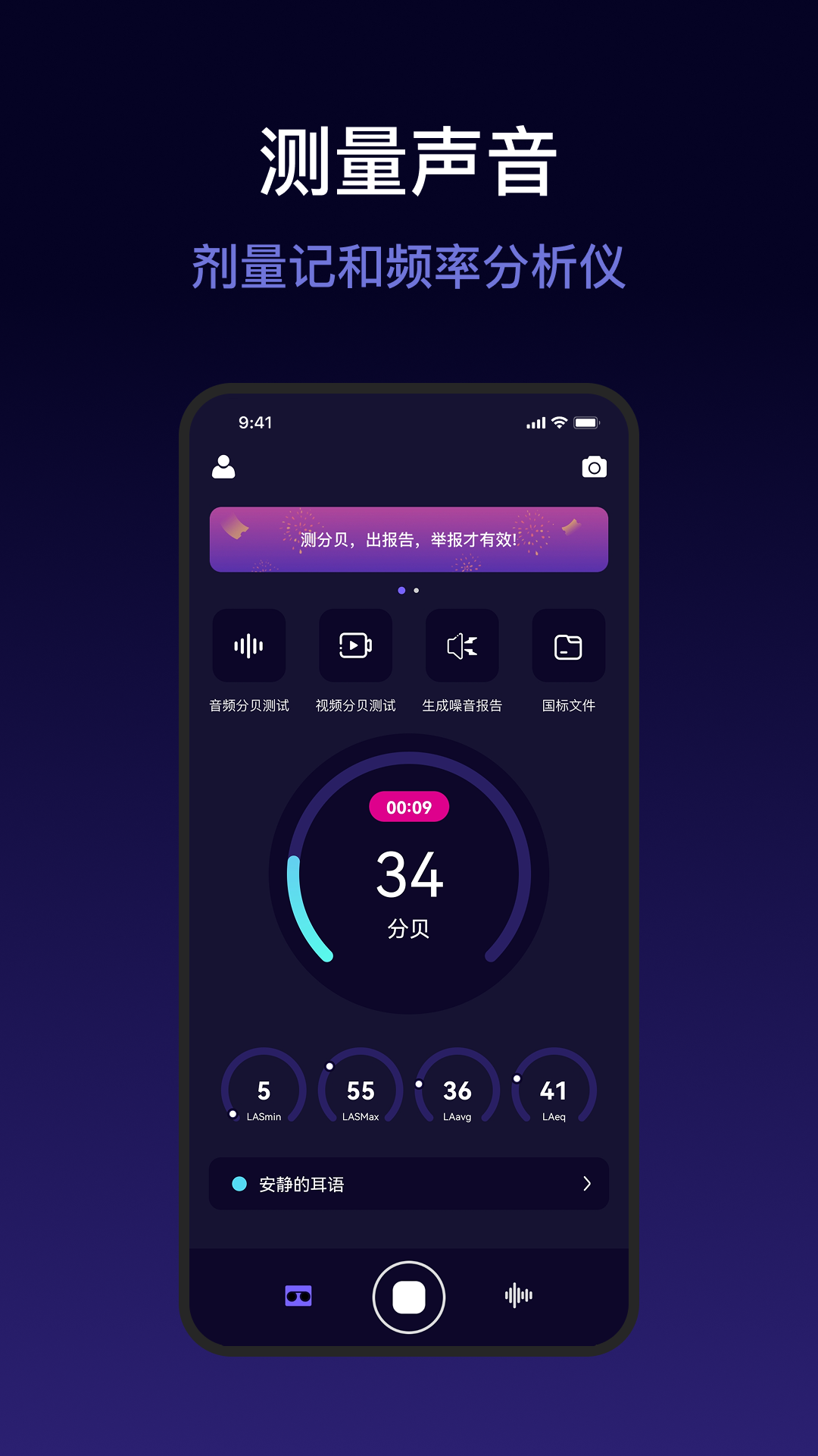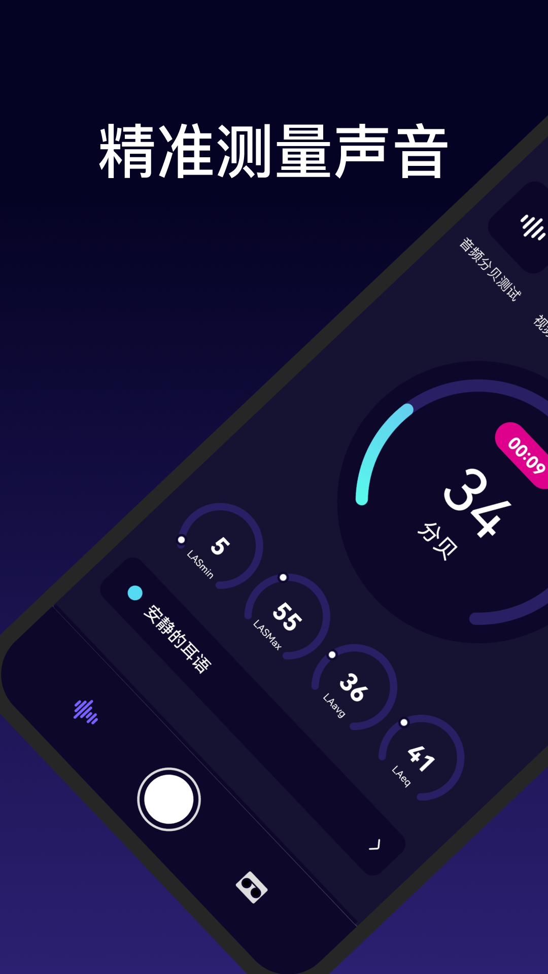 测分贝是一款分贝测试仪,环境噪声音量分贝测试工具。提供高精度专业级噪音检测,快速响应分贝数值变化,A&C计权升级测试算法,噪音测试数值更加精准。 功能特点 -显示每时每刻的分贝动态变化图表,并显示最小/平均/最大/当前分贝值 -环境噪音情况视频记录,噪音分贝数值,噪音测量地点水印 -随时可查分贝测试历史记录-分贝变化/声音/视频 -可生成详细噪音检测报告