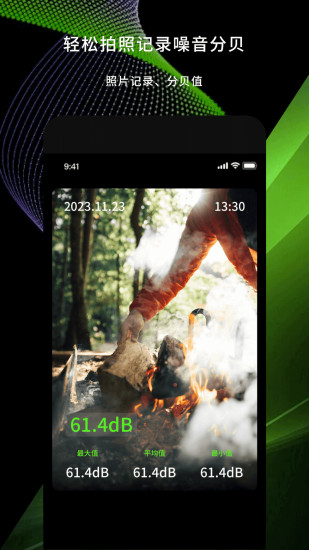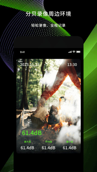 噪音测量检测仪-分贝测试仪,环境噪声音量分贝测试。高精度专业级噪音检测,快速响应分贝数值变化,A&C计权升级测试算法,噪音测试数值更加精准。噪音分贝水印相机拍照&录像,记录环境噪音分贝情况。支持噪音测量高清录音回放功能,最大分贝值&最小分贝值记录,分贝测试结果实时图表显示。无论是图书馆、办公室、学校、卧室、工厂等环境噪音检测,还是家电、汽车、机械、装修的名等设备噪音检测,分贝噪音测试都能轻松搞定,满足您一切关于工作、生活、学习等噪音检测需求。 【专业级噪音计】A&C加权噪音检测算法,高精度噪音分贝测试,理论测量误差 ±1.5db; 【高敏快速响应】实时噪声分贝检测仪,快速响应噪音分贝变化,声源高频率取样2次/秒; 【实时噪音测量】噪音分贝最大值 / 最小值显示,噪音分贝数值稳定,支持分贝数值保持; 【噪音分贝水印】环境噪音情况拍照&视频记录分享,噪音分贝数值,噪音测量地点水印; 【分贝检测记录】超长分贝测试记录保存,详细的噪音分贝信息。检测噪音高清录音回放; 【多领域噪音计】学习生活环境噪音,家电机械噪音,活动工地装修现场噪音等领域检测。