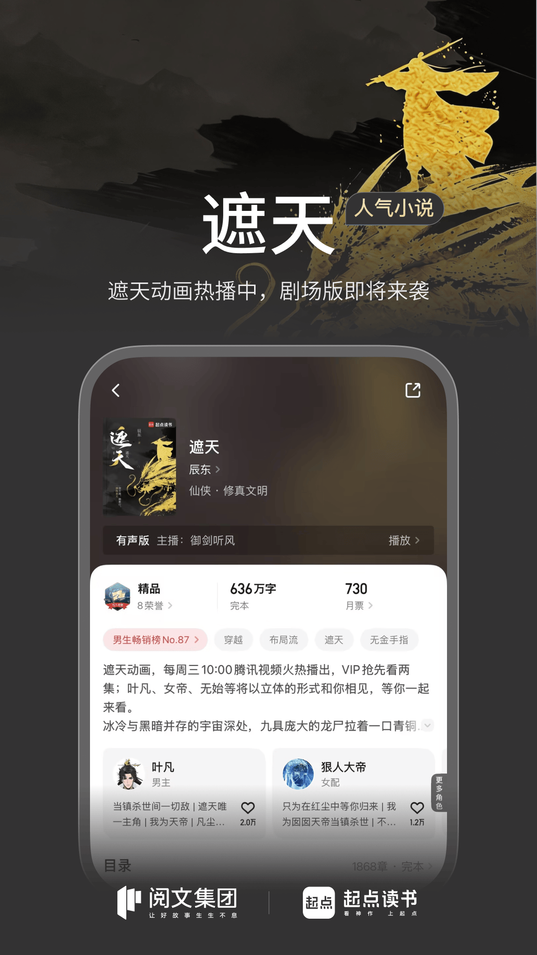 起点中文网官方移动端app,畅享正版原创网文,加入书友圈,和原创作家近距离互动。<br>起点读书品牌全新升级,发布全新品牌主张“看神作 上起点”,致力于为用户持续提供优质且丰富的精品内容。<br> ◉ 超热超全的原创小说书城,中国网络文学的起点,亿万忠实读者的选择~<br>【热门内容】正版原著、精品有声、热门漫画火爆来袭,期待与你相遇;<br>《遮天》:遮天动画热播中,首部剧场版背棺战王腾即将燃炸来袭!<br>《废土边境检查官》:幸福城边境检查官程野,为您服务!<br>《刚准备高考,离婚逆袭系统来了》:人在高三,离婚逆袭系统早到二十年。<br>【分类齐全】全类别热门图书随心看,玄幻、奇幻、言情、仙侠、武侠、都市、历史、游戏、科幻、二次元等,给你想要的一切!<br>【书单广场】不得不看的精选合辑,资深书迷倾情奉献,请允许我们拯救你的书荒;<br> <br> <br>◉ 丝般顺滑的阅读体验和百家争鸣的书评天地,让你彻底沉浸于故事的世界~<br>【体验至上】赏心悦目的视觉效果及轻松舒适的阅读界面,一切为你量身定制;<br>【大神齐聚】名家名作汇聚一堂,速来膜拜你心中的大神~作家感言让真实的大神不再遥远;<br>【畅所欲言】更直接的交流、吐槽社区,更真实地和主人公共同成长;<br> <br>◉ 更多贴心功能和服务等你探索~<br>【免费读书】免费新书热书天天送,让你根本停不下来!<br>【活动中心】精彩活动集结,边玩边赚钱,福利不停歇;<br>【智能推荐】私人定制,精选推荐,转角遇见你的真爱女主;<br>【云端同步】书架、阅读进度、书签、笔记自动云同步;<br>【用户书单】一步创建专属书单,从此爱上分享和发现。<br><br>………………起点读书 • 热门原著………………<br>《择天记》:猫腻经典小说,热血群像故事<br>《惊悚乐园》:超越维度的游戏、追寻真理的竞逐<br>《庆余年》:余年庆有余,不负韶华,不负卿。愿山河无恙,人间皆安。<br>《大奉打更人》:神探修仙,纵横大奉!<br>《赘婿》:愤怒的香蕉经典小说,郭麒麟、宋轶主演热播影视剧同名原著;<br>《龙族V悼亡者的归来》:江南新作,热血龙族,少年归来;<br>《长安十二时辰》:易烊千玺主演,口碑炸裂热播剧集同名小说;<br>《上海堡垒》:鹿晗、舒淇领衔主演科幻战争电影,江南同名小说;<br>《黄金瞳》:张艺兴、王紫璇领衔主演都市探险剧同名小说;<br>《流浪地球》:刘慈欣科幻小说,大热电影原著;<br>《全职高手》:蝴蝶蓝经典大作,超燃热播动漫;<br>《你和我的倾城时光》:赵丽颖主演热播都市商战剧,