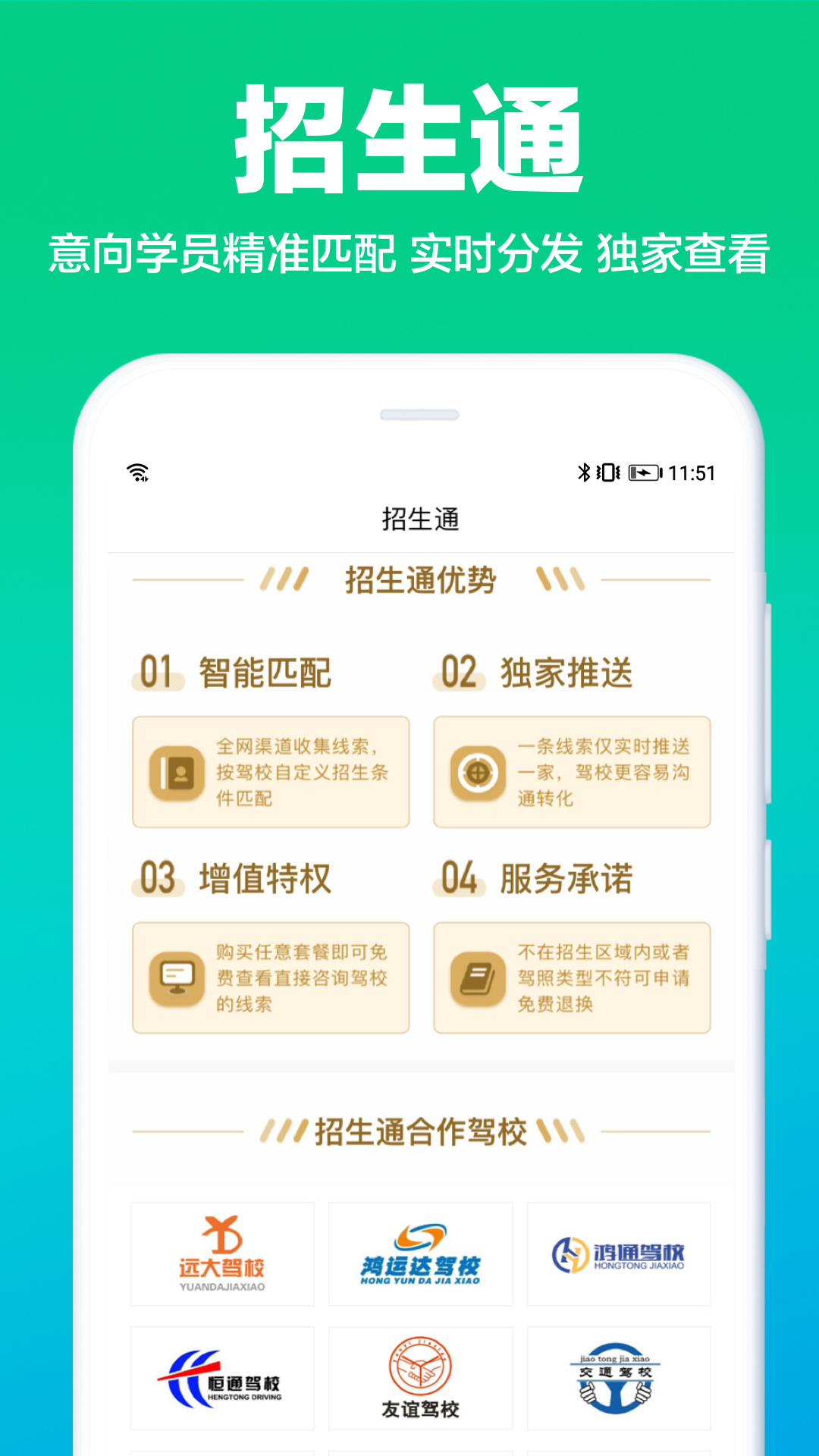 驾校通是一款为驾校和教练量身定制的集招生推广、教学培训、统计报表、运营管理为一体的产品,是驾校和教练的移动管理平台和招生工具,致力于帮助驾校及教练解决招生难题,提升教学水平、管理效率和服务质量。 产品功能 【驾校管理】驾校通移动管理平台,学员档案、招生统计、考试记录、财务报表、员工绩效等实时掌握。 【约课管理】预约培训智能化管理,学员预约、教练排课多种模式,教练实时获取课程安排,教学培训更高效。 【招生通】品牌招生服务,专属特权独家推送意向学员,智能精准匹配,真正解决招生难题。 【报名咨询】整合潜在意向学员、销售跟进全流程管理,轻松提升招生转化和业绩。 【营销推广】招生名片、招生海报、招生段子、限时特惠、优惠券等素材一键获取,随时分享转发。 【教练服务】注册教练官方认证,平台免费展示,教练可收到驾校一点通的学车学员信息,帮助教练招生。