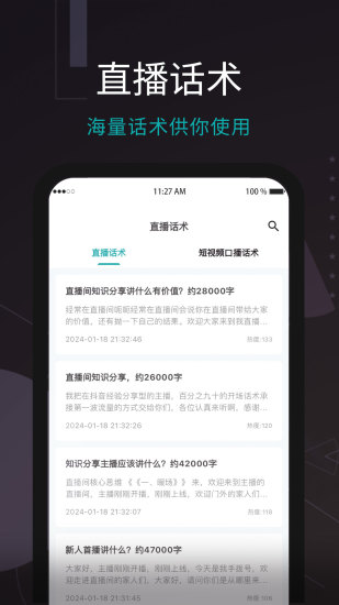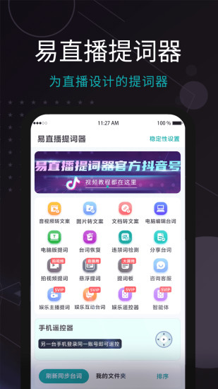 直播总忘词?恐播不敢播?就用易直播提词器,易直播,容易播,一直播,根本停不下来~告别卡顿不NG,让你在镜头前优雅自信~ ①【悬浮提词】搭配抖音、快手、Vlog等众多APP,点击台本下方的悬浮窗按钮,一键开启悬浮窗权限,台词即显示在手机屏幕上方,打开拍摄软件,点击悬浮窗上的播放按钮,轻松提词。 ②【提词板提词】手机就是提词板,全屏展示提词内容,个性主题随意切换。 ③【拍摄提词】任意拖动提词面板,台词贴近镜头,让眼神更加自然。 ④【提词设置】自由调控语速、文字大小、背景透明度等,满足多场景使用需求。 ⑤【文本导入】不想打字没关系,词多多支持无限量文本导入,免去手机打字烦恼。 ⑥【语音转文案】录音转文字,告别手打输入文案。 ⑦【视频转文案】优秀主播直播间录屏话术,一键转文案。 ⑧【电脑编辑】文案太多,告别手机输入,电脑编辑,一键同步到手机提词器。
