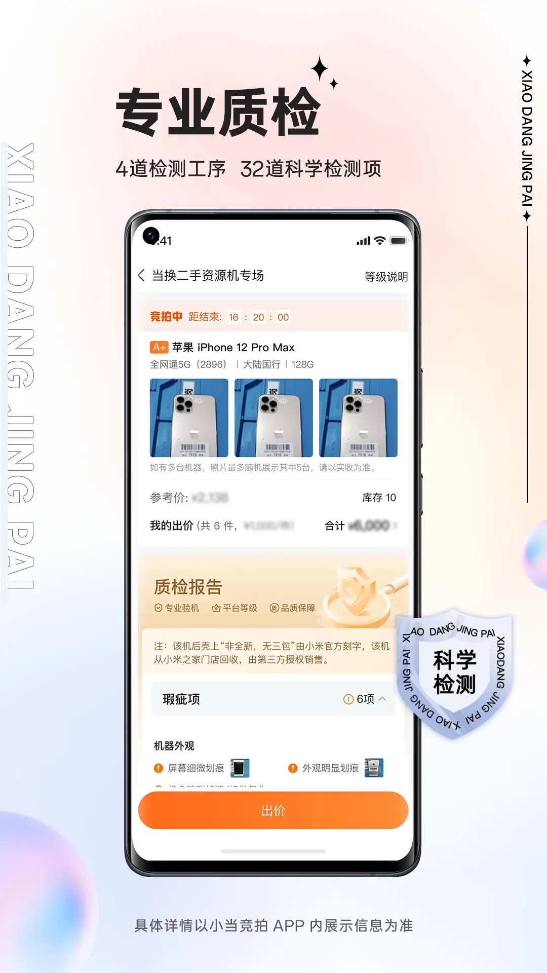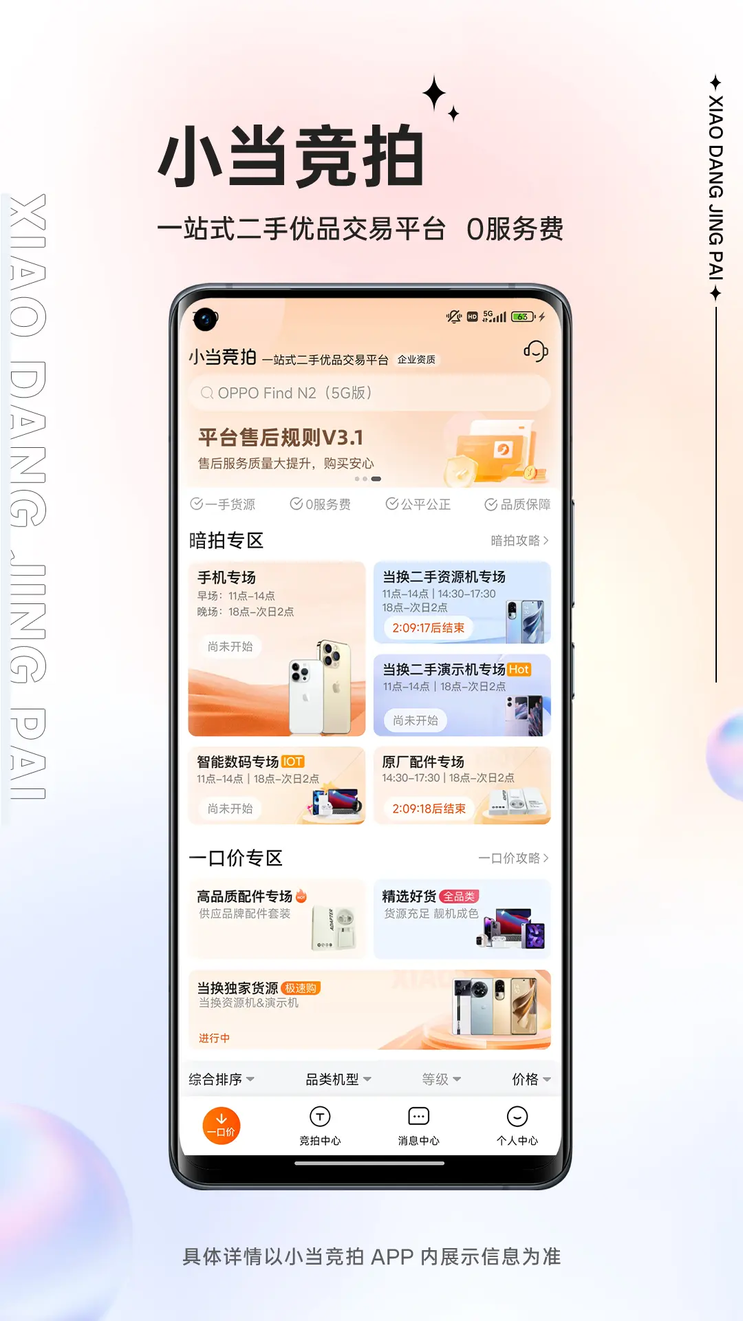 《小当竞拍》APP是专注于二手商家交易的B2B平台,由深圳市小当网络科技有限公司独立自研运营,拥有主流品牌的一手货源,品类齐全丰富。<br>- - - - - - 功能介绍 - - - - - -<br>【一手货源】<br>拥有OPPO、vivo等主流渠道提供的一手资源机、演示机,没有中间商赚差价,质美价廉;<br>【专业质检】<br>4道检测工序,38项全新等级,89道科学检测项;<br>【售后无忧】<br>线上线下专业团队,1对1售后服务 ,交易高效又无忧;<br>- - - - - -- - - - - -<br>【联系我们】<br>关注《小当竞拍》微信公众号:-联系我们-联系客服;<br>下载《小当竞拍》APP-个人中心-在线客服;<br>贴心服务,为每一个商家的买卖保驾护航。