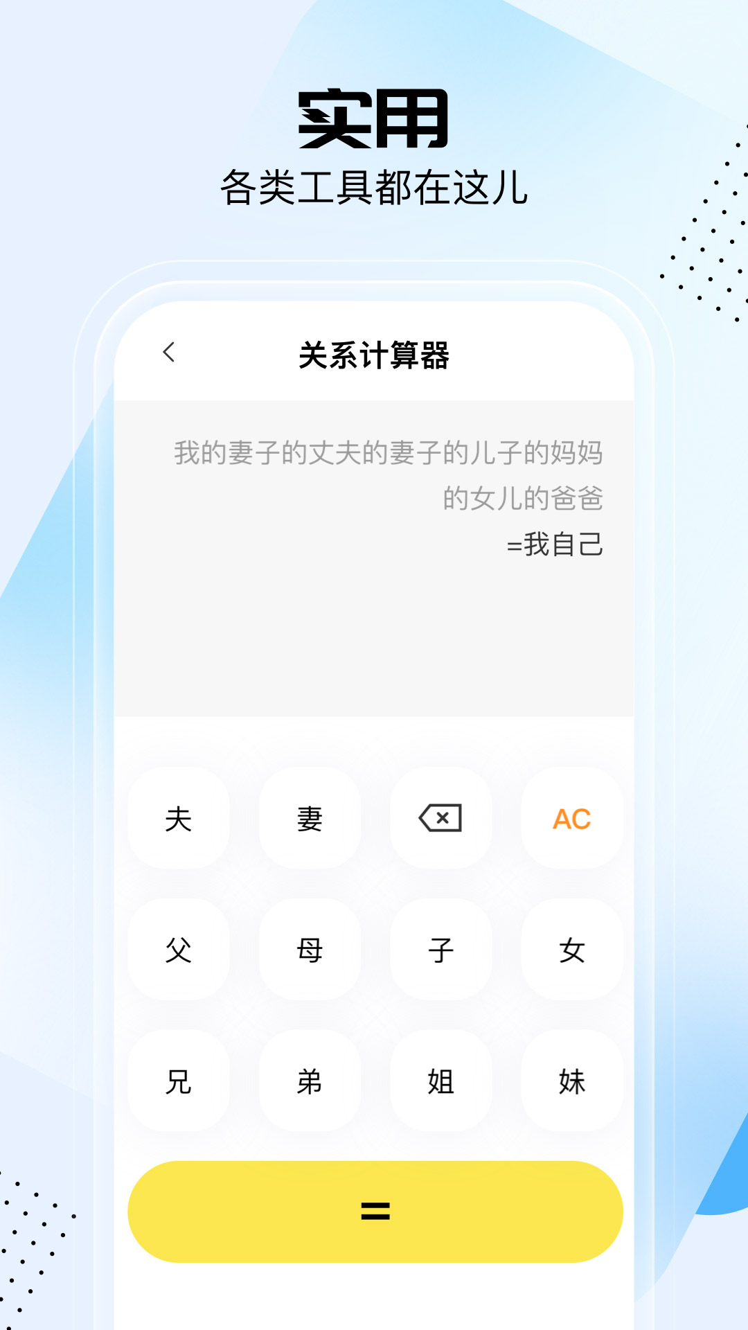 工具大全是一款集合众多实用生活工具的应用,包含三十多种不同的功能,满足您在学习、工作和生活中的各种需求,只需要一个应用就可以解决众多的日常小问题,再也不需要在手机上安装一堆应用啦。 功能列表如下: 全面的单位换算 手机快捷操作之悬浮球 手机参数,获取全面手机配置参数 录屏,强大录屏功能 手电筒,方便的手电筒功能 指南针,显示海拔的指南针 模拟LED屏,手机模拟LED屏 语音广播,文字转语音广播出来 汇率查询,查询实时汇率 车牌查询,全国车牌归属地 万年历 城市区号 亲戚称呼 镜子 噪音检测 量角器 尺子 垂直仪 水平仪 唐诗三百首 元素周期表 全球国家 世界时区 增值税计算 时间计算 房贷计算 个税计算 利息计算 大写数字 屏幕检测 振动/震动检测 本产品会陆续增加新的功能,如果您认为手机还能帮您完成其他我们没有实现的功能,欢迎您向我们反馈,您的想法很可能会在手机上实现哦。 使用中有任何问题或者建议,欢迎关注我们的公众号“欢乐与智慧”或者通过关于界面的联系方式,与我们联系反馈哦!