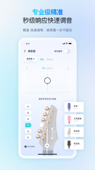 吉他等弦乐器每根琴弦有着不同的音高,按照标准的合适的音高范围进行调音,弦乐器才能演奏出美妙音乐。 用于帮助弦乐器调音的工具就是调音器,比如经常用的吉他调音器。 相较于传统的调音设备,调音器软件是通过手机麦克风,接收识别每根弦的频率和声音,按照相应的标准进行调校,并且随时随地都能进行调音。 吉他调音器Pro,就是一款专业的调音器软件,随时带在身边的吉他调音器。 吉他调音器Pro主要亮点: 1、采用国际音高标准,科学专业的调音效果 2、高精准度的调音器,调音误差低于0.1音分 3、适合学习各类弦乐器,不止吉他,还有尤克里里、小提琴、贝斯等 4、自由选择自动调音或手动调音模式,不同水平的学习者都可以找到合适的调音模式 5、直观的视觉提醒,每一根弦调音过程都有突出提示,避免错调、误调 吉他调音器Pro,非常好用的调音器App。功能丰富,简单实用,初学者也可以快速掌握使用技巧~让我们一起学习吉他,尤克里里,一起演奏音乐弹琴吧!