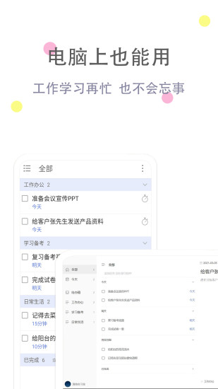 无广告、无启动页、秒开App 手机和电脑可实时同步数据,极简设计,超简洁清爽页面,一秒上手。 高效能人士的好习惯,工作办公、学习备考、日常小事都可轻松记录 多重消息提醒,重要的事情不忘记! 【工作办公 日程备忘】 开会、整理资料、写PPT... 工作到一半突然开会、突然接到电话,然后忘记一些事情? 清单陪您一起高效工作,从繁杂的工作中解脱,在电脑或手机将待办事项记录下来,不再因忙碌而遗漏重要的事情。 工作更高效,拒绝996加班 【学习备考 锁机自律】 拒绝复杂的设置,轻松一点即可锁住手机,极易上手 专注学习、避免沉迷于手机娱乐之中 在宿舍、家里自习也能高效学习 锁机+待办清单,做好备考计划,谋定而后动,一战成硕、一举上岸! 【生活日常 习惯打卡】 生活中的小事也可以井井有条:提醒拿快递、办理证件、还信用卡、还房贷、去某个地方、亲朋好友生日... 习惯打卡:早睡早起、定时锻炼、英语练习... 每天、每周几、每月几号、每隔几天、艾宾浩斯遗忘曲线多种定时规律 【桌面小部件 不用打开App也可以看到待办事项】 20多种预制主题、恬静优雅风格 强大的DIY功能,各种颜色、字体、显示、隐藏、随你定义. 全透明配色、年度流行色配色一键设置 如果喜欢篮球或足球的,还可以自由搭配球队配色,如巴萨、湖人 【效率统计 数据分析】 多彩图表:颜值控表示很喜欢,除了好看,还是好看 时间轴: 记录每一天的时间分布