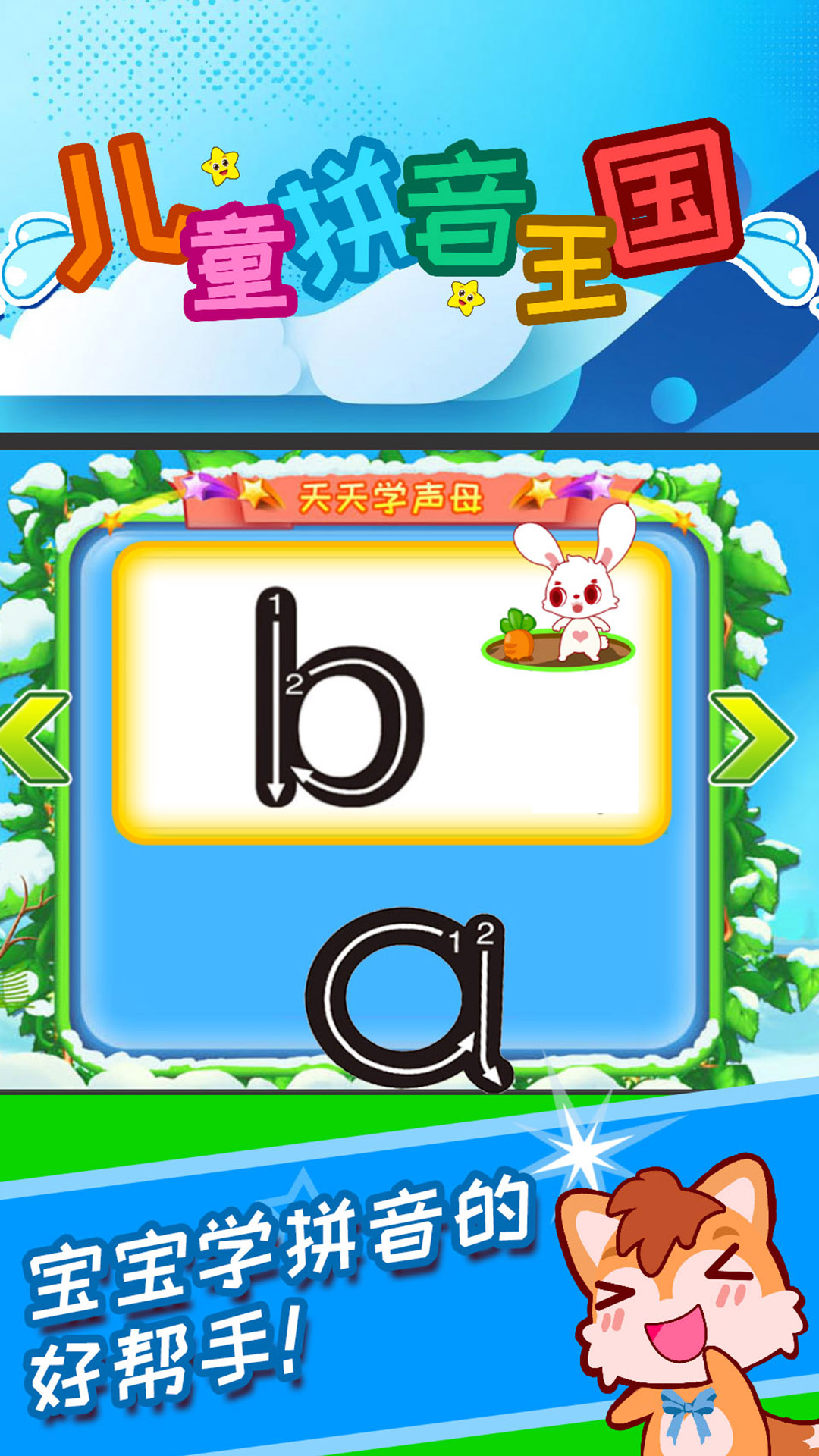 儿童宝宝学习拼音和汉字的好帮手! <br>拼音是认识汉字、学好普通话的基础, 在孩子学习语言的过程中起着重要的作用。 <br><br>《儿童拼音王国》寓教于乐,融合了拼音笔顺、词组发音、卡通插图以及朗朗上口的顺口溜。 结合图形卡片以发散形记忆方式,让儿童更快的掌握标准的拼音发音。掌握了拼音技能后就能自己学习唐诗国学,看故事书绘本等。<br><br>【软件特点】:<br>1、学习模式:包括声母、韵母、整体音节;结合动画进行学习;学习字母的书写;学些拼音的拼读;学习拼音对应的汉字;<br>2、测试模式:学习完成后,可以对韵母、声母、整体音节测试,也达到了巩固记忆的效果。