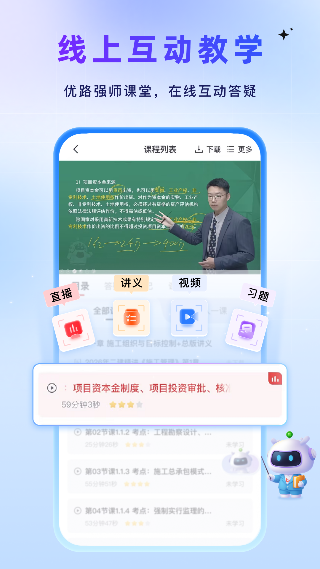 优路教育深耕职教培训21年,拥有数百家分支机构,覆盖建工、消防安全、财经、医卫康养、招考学历、职业资格等百余项学习项目,为您提供一站式备考服务。<br><br>【特色项目】<br>开设一级建造师、二级建造师、一级造价工程师、监理工程师、一级消防工程师、消防设施操作员、中级安全工程师、无人机、执业药师、中级经济师、健康管理师、公共营养师、心理咨询师、社会工作师、助理社会工作师等多个热门项目。<br><br>【智学课堂】<br>推出私教一人一课Pro智能学习平台,依托AI大模型为学员定制个性化学习方案,通过智能算法推送针对薄弱项的练习题;支持文字及拍照搜题实现秒级响应,配备AI课程导学、课堂笔记和实时答疑功能,助力提升备考效率。<br><br>【智能题库】<br>每日一练、章节练习、历年真题、专项题库、模拟试卷、模考大赛等多元刷题模式,能针对性进行学习检测及巩固,帮助学员靶向突破薄弱环节。<br><br>【干货资料】<br>海量备考资料免费下载!从基础入门到冲刺预测的全阶段备考资料,包括核心要点汇总、高频考点精编和预测题集等优质资源,帮助考生系统掌握知识点。<br><br>【AI智能助教】<br>小U智能助教作为专属学习伴侣,可实时互动交流、快速解答学员问题,同步收集学习数据并实时反馈、优化个性化学习计划,助力学员备考加速。