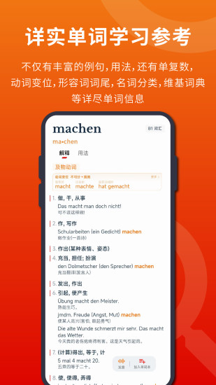 德语背单词是专为德语学习者设计的背单词软件。海量原声例句搭配艾宾浩斯记忆法,助你在了解单词真实语境的同时,科学高效的背单词。 【丰富词书】 涵盖当代大学德语、新求精德语等主流德语教材,专四、专八、德福、欧标等考试高频词汇,更有名人著作、动词变位等进阶课本供你挑选。你需要的德语词书,这里都有。 【原声例句】 收录《每日德语听力》中的海量原声例句,内容出自你喜欢的电影、剧集,或是DW、Tagesschau、Deutschlandfunk、Logo等专业新闻,助你了解单词的真实单词语境,专业高效地记忆单词。 【科学记忆】 根据艾宾浩斯记忆曲线,德语背单词内置了科学高效的记忆算法,识别你当前单词的熟悉程度,分析你的记忆遗忘曲线,在单词遗忘的临界点提醒复习,使你更多地把时间花在不熟悉的单词上,而不是一再回顾那些很熟悉的单词,从而实现背单词的高效率、抗遗忘。同时,软件会动态调整单词复习计划,助你轻松高效的完成大量单词的学习。