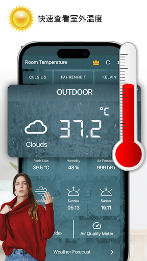 室温温度计可测量摄氏度 °C、华氏度 °F 和开尔文 °K。根据您的位置测量室内外温度和湿度。<br><br>室内温度计可帮助估算房间环境温度。简易温度计可测量室内和室外温度。应用根据位置显示当前室温和天气温度。<br>功能:当前温度、湿度、气压、智能温度计、体感温度、日出日落、紫外线指数、空气质量和温度小组件。<br><br>恒温应用支持多单位温度监测,并提供校准功能。<br><br>简易室内外温度计<br>精准显示真实温度<br><br>使用温度扫描器测量<br><br>内置传感器提高精度<br><br>定位获取室外温度<br><br>单位:摄氏、华氏、开尔文<br><br>天气图标<br><br>湿度测量<br><br>如何查看温度<br><br>打开应用并等待<br><br>开启网络<br><br>查看当前温度<br><br>重要提示:<br><br>需要网络连接<br><br>请允许位置权限<br><br>将手机平放 5–10 分钟<br><br>避免靠近过热或过冷物体<br><br>电池发热会影响测量<br><br>支持邮箱:<br>morsoltechnology@gmail.com
