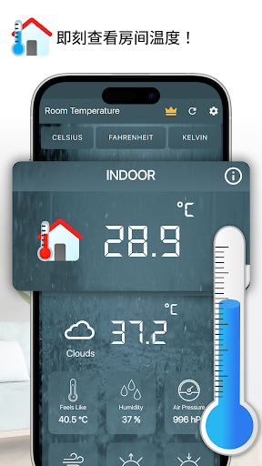 隆重推出我们的室温、温度计应用程序:您的终极数字温度计<br><br>使用我们的室温温度计应用程序将您的智能手机变成智能温度计!这款免费的温度应用程序是您的温度监测一体化解决方案。作为室内恒温器、温度检查器和湿度计,它提供与专业气温计相当的准确读数。<br><br><br>我们的室温测量应用程序的主要特点:<br>恒温器:获得以摄氏度、华氏度或开尔文为单位的精确温度读数。<br>天气预报:访问每小时、每日和每周的天气预报以及当前的天气状况。<br>湿度计:获取准确的湿度读数和温度数据。<br>日出和日落时间:随时了解每日太阳时间表。<br>感觉像温度:了解户外的实际天气体验。<br>气压:监测大气压力以获取全面的天气信息。<br>风速:随时了解您附近的风况。<br>室内温度:利用手机的热传感器获得精确的室内读数。<br>室外温度:通过超本地气象站获取精确的室外温度。<br>30 天天气预报:提前计划详细的每月天气预报。<br>温度计小部件:直接从主屏幕快速访问温度数据。<br>温度扫描仪:本地或在线记录并保存温度数据。<br><br>无论您需要房间温度计、综合温度检查器还是高级恒温器应用程序,我们的应用程序都能满足您的需求。它不仅仅是一个温度应用程序;它是您的私人天气助手。<br><br>常见问题 (FAQ):<br>智能手机可以测量温度吗?是的,有了我们的智能温度计,您的手机就成为了准确的温度测量工具。<br>此应用程序与 Android 设备兼容吗?绝对可以,确保在 Android 上实现恒温器和温度计功能的无缝体验。<br>这个温度计应用程序的准确度如何?得益于先进的人工智能算法,我们的数字温度计保证精度在 ±3°C 以内。<br>提高温度读数准确性:通过移除手机壳、冷却手机和最小化后台应用程序来提高准确性。<br>测量室温:下载我们的应用程序,以便在您的生活或工作空间中进行高效的温度管理。<br><br>全球温度跟踪和天气洞察:终极室温温度计应用程序<br><br>使用我们的室温温度计应用程序体验无与伦比的便利,这是您监测全球温度的数字解决方案。无论是在纽约这样的繁华城市、加利福尼亚州这样的广阔州,还是英国和美国这样的国家,这款免费的应用程序都可以提供实时温度和湿度读数。根据您的特定设备定制校准,以确保在任何环境下的准确性。探索详细的天气洞察,包括风速、气压和湿度水平,所有这些都触手可及。该应用程序的自动校准可确保读数与专业气温计一样准确。它支持多种温度单位和多种格式的可见性数据,其设计具有用户友好的界面,优先考虑隐私和数据保护,完全符合 GDPR 标准。相信它可以满足您的温度监测需求。<br><br>立即下载并随时了解您的环境(24/7)!