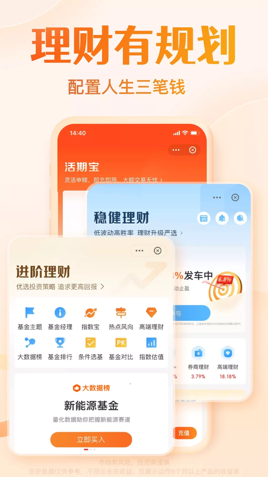 专业理财就上天天基金! 天天基金是上市公司东方财富全资子公司,证监会批准的首批独立基金销售机构。 致力向投资者提供权威、专业、及时、全面的理财服务,涵盖基金交易、金融资讯、理财行业动态、基金数据等内容,更有来自专业机构的基金评级、投资理财分析等帮助投资。 【核心特色】 理财产品多:业内基金多品类覆盖,基金数量超2万只; 基金交易快:便捷开户、交易稳定,理财安全放心; 客户服务好:全年无休,7*24小时客服不间断; 理财费用省:买基金优惠多,申购费率1折起,个别基金除外。 【产品亮点】 1. 活 期 宝:包括多种货币基金,免费充值取现; 2. 稳健理财:汇集低风险和中低风险的中短债基、长期纯债、固收+等产品; 3. 基金优选:汇集中风险以上的股票型基金、指数型偏股基金、混合型偏股基金、QDII等产品; 4. 高端理财:汇集证券公司资产管理计划、基金公司及其子公司专户产品; 5. 智能定投:按期定投,达到目标收益后,若上涨继续持有,若回撤及时止盈。