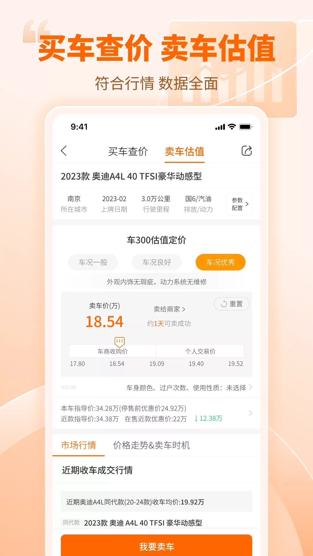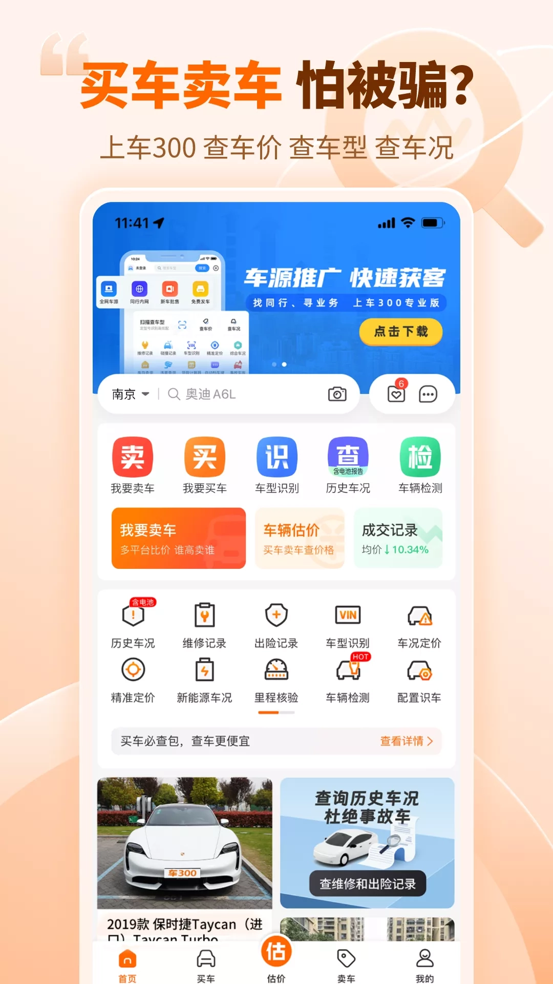 买卖二手车,先上车300! 查车价、查车型、查车况! 【二手车估价】 1.免费估值:买车查价,卖车估值,看真实成交记录。为全网95%的二手车交易提供估值服务 2.精准定价:基于车身颜色、使用性质、真实车况等因素的定价 3.车况定价:基于车辆历史出险记录、维修记录的定价 【二手车必查工具】 1.车型识别:准确识别车辆型号、年款、参数配置信息,核验高低配,买车更放心 2.综合车况:一键查维保、出险、新能源电池、事故车信息,杜绝事故车,买车不吃亏 3.维修记录:查车辆历史维修记录、保养记录和公里数 4.出险记录:查车辆历史出险记录、事故理赔金额 5.新能源电池:查电池损耗程度、电池组安全性能 【买车服务】 1.二手车海量车源:聚合全网多平台车源,真实可靠 2.二手车价格参考:车300估价参考,性价比判断,同款近期成交记录等 3.新车底价特卖:特价优惠,底价新车抢先购 【卖车服务】 1.高价卖车:免费帮卖,一键推送多平台比价,谁出价高卖给谁 【用车服务】 1.车辆残值追踪:爱车残值变化实时掌握 【关于我们】 南京三百云信息科技有限公司是国内优秀的以人工智能为依托、以汽车交易定价和汽车金融风控的标准化为核心产品的独立第三方的汽车交易与金融SaaS服务提供商。 品牌致力于为广大车商、二手车交易平台提供基础数据库服务,自研车300 伽马风控系统服务于银行保险机构、汽车主机厂和车贷金融公司。 【联系我们】 官方微信号:che300 官方微博:@车300 官网:http://www.che300.com 客服电话:400-858-7585转1 注: 1、您在使用应用时,我们需要访问您的相机,以便获取车辆图片,识别车型信息。 2、您在使用应用时,我们需要访问您的GPS,精准定位帮您快速找到附近优质车源,以及相关的优惠活动。