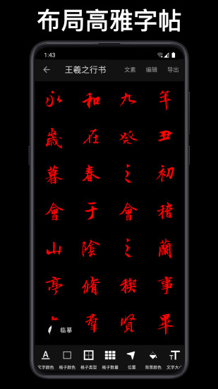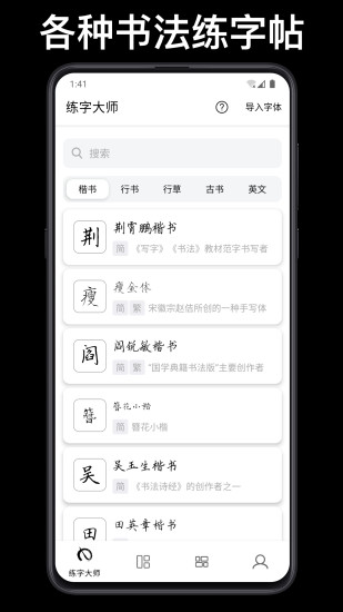 练字大师是通过手机或Pad自动生成电子字帖并支持导出打印的工具,让你告别购买纸质字帖,实现字帖自由。练字大师支持中文、英文、韩文、日文等多种语言的字帖生成,同时支持楷书、行书、草书、瘦金体、大篆、小篆、隶书等多种书法字帖。同时练字大师完美支持Pad上Pencil临摹描红。再也不用为书法练字帖发愁了。 --------- 主要功能 --------- 1、支持免费导出以及打印字帖 2、支持各种练字纸:方格帖、田格帖、米格帖、拼音田格帖、米格帖以及各种英文帖 3、内置各种文素内容:唐诗、宋词、元曲、古文、佛经、常用字等 4、文字颜色,百余种颜色任意搭配 5、格子颜色,百余种颜色任意搭配 6、背景颜色,百余种颜色任意搭配 7、格子数量,根据喜好自由设置 8、字的位置,可以自由调整 9、文字大小,可以自由调整 10、文字粗细,可以自由调整 11、支持删除、添加标点符号 12、支持横竖文字排列 13、支持印章模式 希望大家能学习享受书法的乐趣。 如果有任何意见,或者疑问,可以在App中的意见反馈留言,或者 E-mail: wanglianwu.love@163.com