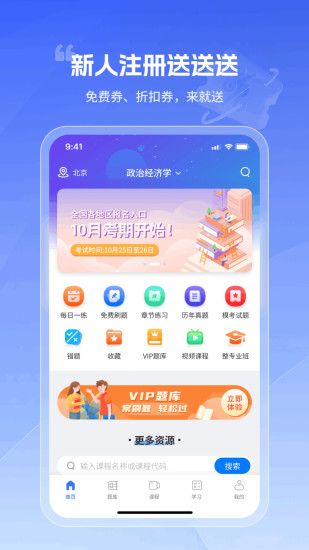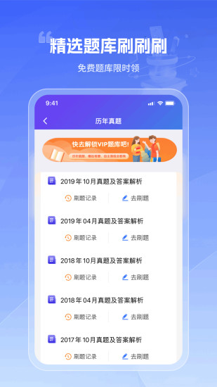 自考题库是一个针对全国自学考试用户的题库,包含了自考本科专科中考试大纲所确定的知识点。更有历年真题及模拟试题题型,题库中的试题全真模拟真实的考试,是各位考生学习乃至通过考试的好帮手。 1、一站式备考题库,试题随意刷 自考题库APP有模拟考场、考点练习、错题重做等多种学习与做题模式,可以让你尽情刷题备考,随时随地利用空余时间都可以做题,提高复习效率。 每日一练:基于大数据运算,每日打卡刷题! 错题集:错题自动收录,查漏补缺! 模拟试卷:仿真试题,自由组卷,自动评分,提前检阅考试成果。 智能出题:智能组卷,单选题、多选题、主观题等逐个击破! 考点练习:强化训练自学考试热点、难点、常考点。 历年真题:今年考什么,还得多参考往年考什么? 2、一键拍照式搜题,难题全搞定 自考题库APP可以直接一键拍照搜题,快速准确解决难题,同时也可以根据使用场景,选择文字、语音等方式搜题找答案,帮助大家攻克各种难题。 3、视频精讲,优质教学 精讲课从基础抓起,汇集考点和易错点,把握方向。