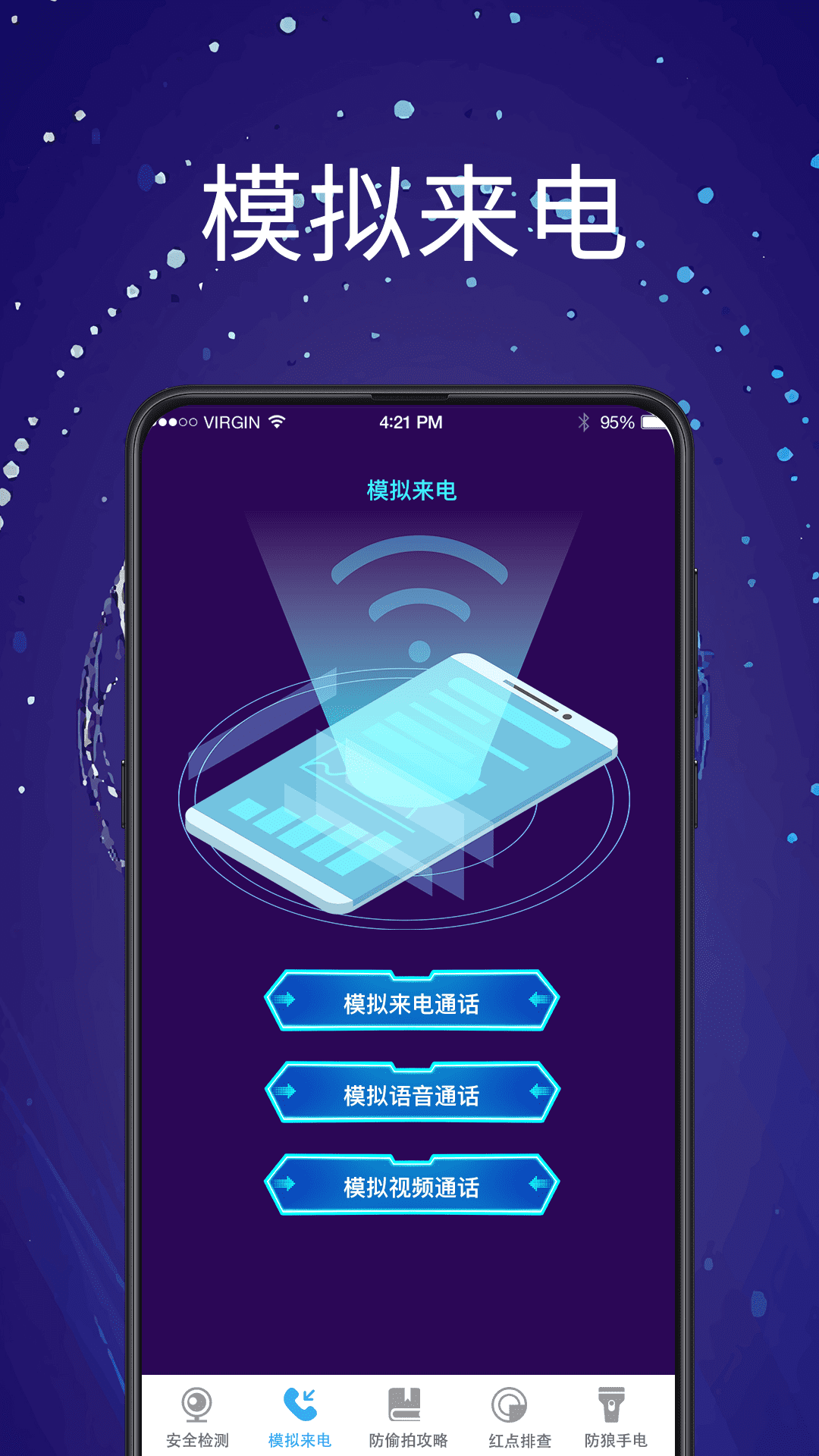 一款出门在外的小工具,可以帮您尽量排除身边隐藏的隐患,安全宝能够准确靠谱帮您找到联网偷拍摄像头,是保护您和家人朋友隐私安全的好帮手!<br>旅游住酒店、民宿、客栈,生活中租房、合租、拼宿舍,去购物在洗手间、更衣室、化妆间,偷拍摄像头可能无时无刻在偷拍您的隐私,猥琐大叔透过双面镜偷窥您的生活。更可怕的是偷拍已经成为产业链,您的隐私可能成为别人在网络观看的视频。<br>手机相机发现红点、保护您的隐私安全。<br>防狼手电,必要时可发出闪光,原离不安全<br>模拟来电:遇见不想应酬的人,想离开,却正烦着找个理由?使用虚拟来电,通过设置姓名、号码、来电语音、来电次数,来电间隔,来电界面,软件会在指定时间会模拟来电来迷惑对方,让对方误以为别人有急事找你,借此脱身!