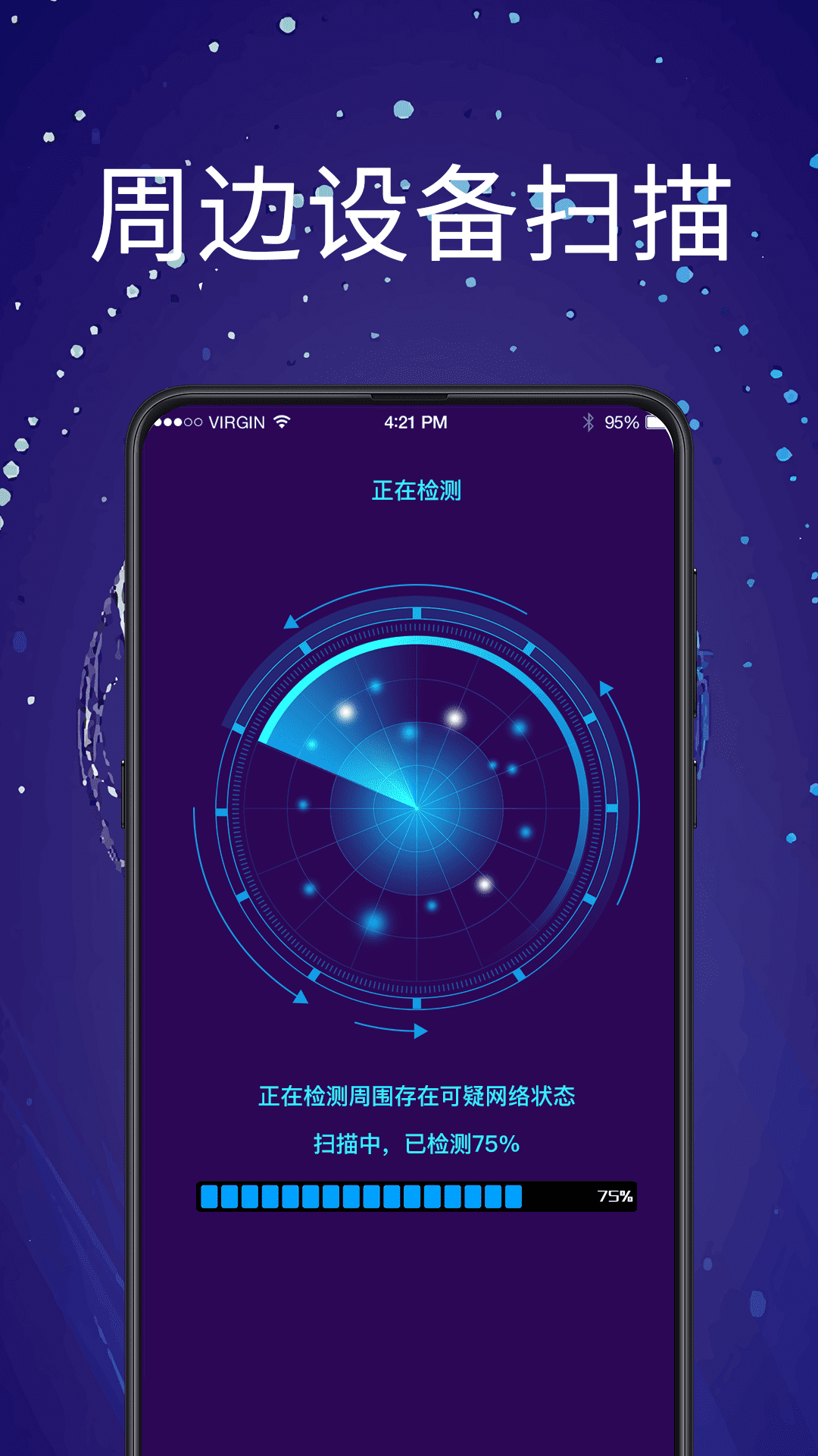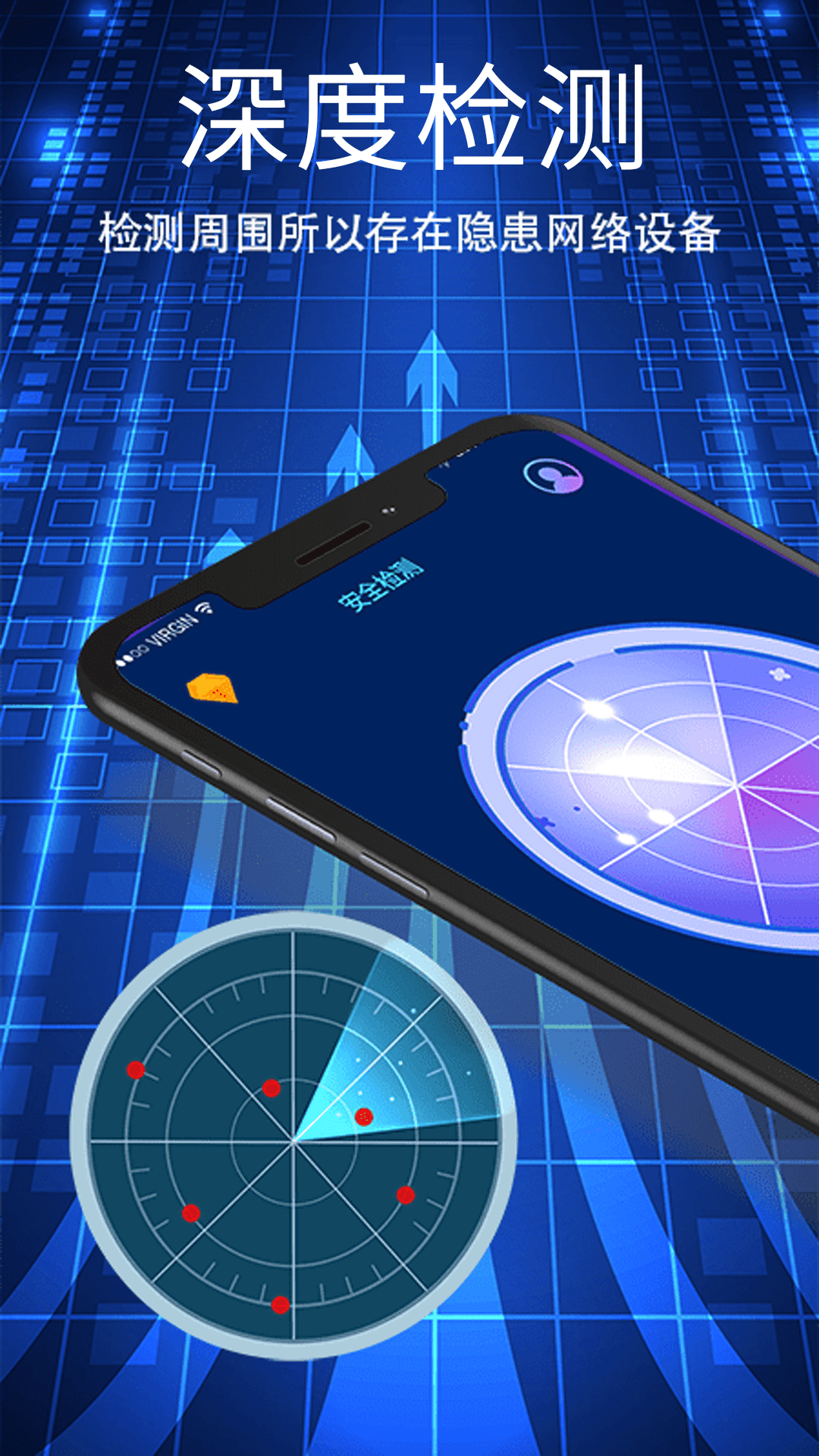 本软件是一款高科技防偷拍的软件,现在大家的隐私问题越来越难以的到保障,出门在外如果遇到住宿的需求,就可以使用这款软件全方位扫描房间内的各个角落,快速精准扫描身边的摄像头,让它无处顿藏。<br><br>软件功能:<br>- WiFi摄像头检测:<br>通过连接WiFi及手机定位分析获取网络下的摄像头设备,并通过通信协议查询出是否是针孔摄像头,使用fing原理进行多维度综合检测保护您的隐私安全;<br>- 蓝牙摄像头检测:<br>通过开启蓝牙扫描周边的设备信息,并通过强大数据匹配,Al智能检测获取针孔摄像头设备,保护隐私安全;<br>- WiFi测速:<br>针对链接网络一键测试传输速度。