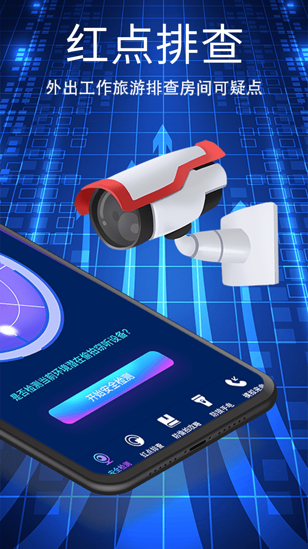 有效探测酒店网络摄像头,规避隐藏监控摄像头风险,防拍神器; 这是一款好用的保护隐私的生活小工具,强大的数据挖掘技术,可以供您参考,将所有隐藏的网络摄像头一网打尽,比传统的使用手机相机扫描红点的方法更有效; 一键检测、快速分析,您手机上的防拍专家,保护您的出行投宿隐私安全 强大的数据挖掘技术,可以供您参考,将所有隐藏的网络摄像头一网打尽,比传统的使用手机相机扫描红点的方法更有效
