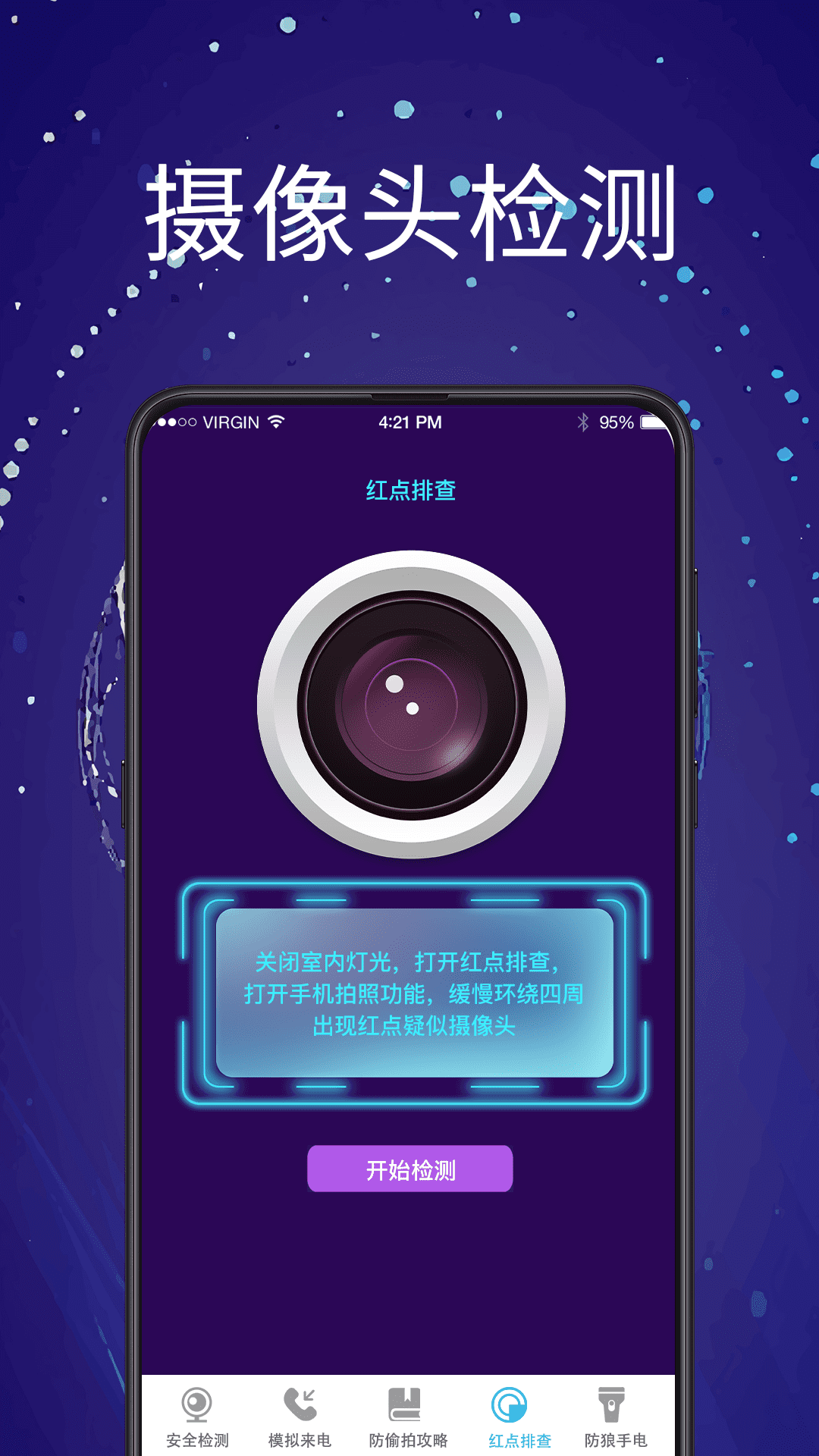 隐私保护专用!<br>【专业探测】<br>通过技术手段,进行多维度综合检测,检测隐藏摄像头,发现红点。<br>新闻上经常看到有人在住宿酒店、民宿、租房时,被坏人偷录,隐私权遭受到严重的侵犯。<br>【私密相册】<br>可以安全保护您的私人相片和视频以及录音。当您输入您设好的主密码时,它可以解锁进入您的私人相册库;<br>它还可以一键变身,表面上看起来是一个可以正常使用的计算器,实际上却是一个可以帮助您保护私人照片、视频!想进入隐私空间,必须输入您预设的密码并点击“%”确认。没有密码,没有人可以偷窥您的隐私!