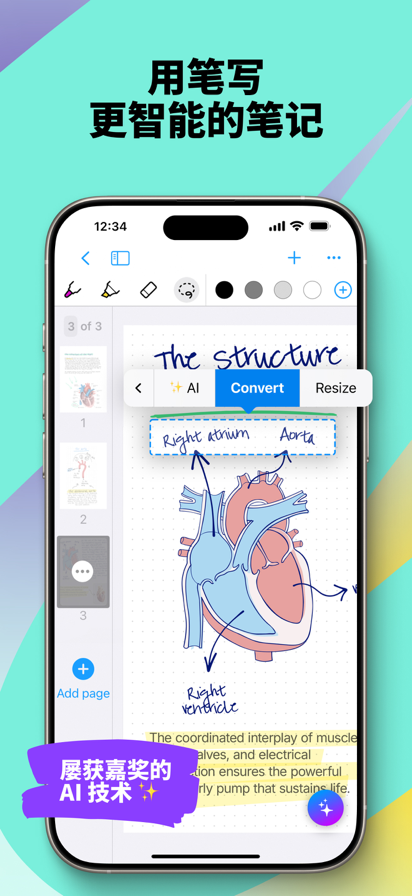 轻松手动创建令人惊叹的笔记和专业文档,在无限版面上集思广益并无缝批注 PDF。MyScript Notes 采用世界领先的 AI 手写识别技术,提供了一个动态平台,让手写、文本、绘图、图表和图像在可扩展版面上无缝共存。通过直观的笔势增强您的笔记体验,轻松将手写内容和手绘形状转换成输入文本和精确形式。 MyScript Notes 可以理解您以 66 种语言书写的每个单词,并且适用于所有平台 - 因此您可以从任意设备访问和搜索您的笔记。 在一款应用中获得 4 种强大的体验: • 创建具有固定尺寸页面的无限量笔记本来记录您的日常笔记。 • 在白板上记录形式自由的笔记:全世界最先进的无尽版面。 • 手写响应式文档,添加数学计算和图表。 • 将现有文件导入为 PDF,随时进行批注。 ———————— 数字手写 - 在同一页面、句子甚至单词中书写¹、输入或听写。 - 将手写内容和数学公式准确转换为输入文本,并将绘制的图表转换为完美形状。图表在粘贴到 PowerPoint 中后能够保持可编辑性! - 用触控笔书写表情和符号。 用触控笔编辑 - 使用直观的笔势编辑和格式化内容,无需打断工作流程。 - 使用马克笔突出显示或上色,用套索选择,并用橡皮擦删除整个笔划或精确定义的内容。 在白板上自由地书写、打字和绘画 - 畅享无限版面,非常适合脑力激荡、思维导图和和自由做笔记。 - 平移并缩放以获得新的视野。 - 使用套索选择、移动、复制、删除或调整内容大小 - 并将手写内容转换为输入文本。 切换到文档以获得响应式体验 - 创建和编辑结构化笔记 – 您的手写内容将根据需要自动重新排版。 - 编辑,调整布局,旋转设备或分屏,无需担心可读性。 丰富您的笔记 - 使用各种类型的笔和页面背景创建个性化内容。 - 添加照片、简图和智能对象,例如数学公式和图表。 - 跨多行手写数学公式和矩阵,解决简单的计算并将数学公式拷贝为 LaTeX 或图片。 ———————— MyScript Notes 尊重您的隐私,永远不会在未获得您明确同意的情况下将内容存储在我们的服务器上。 要获得帮助或请求功能,请在 https://myscri.pt/support 提交工单 访问 MyScript Notes 网页,了解更多跨平台信息:https://www.myscript.com/notes ———————— ¹您可以使用任何兼容的主动式或被动式触控笔(包括 Apple Pencil)在 MyScript Notes 中书写。请查看 MyScript Notes 的最低和推荐要求:https://myscri.pt/notes-devices
