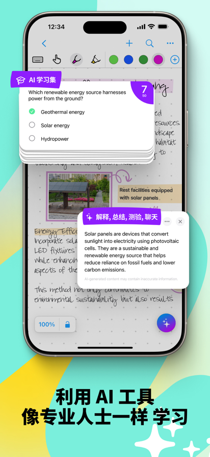 用 Notability实现创想!免费下载,享受强大但简约的笔记体验。您很快就会明白为什么我们会荣获 Apple 编辑选择奖! 正如您一样,Notability 也多才多艺。记录点子,导入和标注教科书,录音,学习小测试,或者起草您的下一部杰作。不论您是学生、专业人士,还是爱好者——您都能找到所有您需要的工具。 强大的电子纸 • 运用多媒体工具做笔记,例如铅笔工具、高亮工具、文本和音频。 • 在教科书、文稿、讲义、作业或图片上做标注。 • 搜索笔记里的任何内容,包括手写内容和文稿。 • 使用数学转换工具快速计算。 自然地手写和画草图 • 用市面上效果最逼真的矢量数字笔书写。 • 墨水工具已优化,可以带来最丝滑的书写体验(兼容 Apple Pencil 和罗技 Crayon)。 不用纸张,就能保持井井有条 • 所有笔记集于一处!随身携带笔记,但没有重量,也没有麻烦或废纸。 • 用可自定义的主题和文件夹来整理笔记。 音频回放帮您不错过任何要点 • 借助与笔记内容同步的录音,充分挖掘课堂和会议的内容。 • 音频转录脚本中可以搜索或拷贝带有时间戳的文本。 轻松演示 • 支持全屏演示,不会看到分散注意力的工具栏。 • 运用 Notability 的十八般工具吸引受众注意,例如激光笔。 利用多笔记功能进行多任务处理 • 并排处理两个笔记。 • 笔记之间可拖放手写内容、输入的文本和图片。 导入、标注和分享 • 可导入和标注 PDF、DOC、PPT、图片、GIF 等等文件。 • 用文稿扫描仪轻松创作可搜索的 PDF。 --- 在 iPad、Mac 和 iPhone 上免费下载 Notability。 购买 Notability Plus 包年订阅,即可解锁无任何限制的高级笔记体验。订阅者可获得: • MyScript 手写内容识别和数学转换技术。 • 无限制的编辑、音频转录、自动备份支持和 iCloud 同步等等。 --- 订阅会自动续期,除非取消订阅,且会通过 Apple iTunes 帐户收费。价格因地点而异。 如需技术协助,请联系我们的团队:support@gingerlabs.com 隐私政策:https://notability.com/privacy Terms of Service: https://notability.com/terms Notability 是 Ginger Labs, Inc. 的注册商标。
