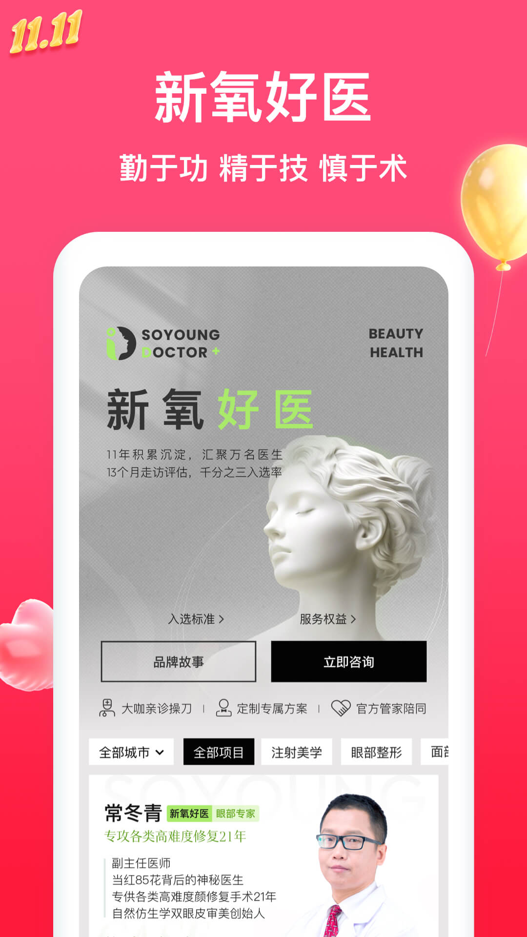 新氧SOYOUNG——中国互联网专业医美平台——提供查询、挑选和预约医美服务<br><br>2013年成立以来,新氧以“让1亿中国人轻松医美”为使命,致力于为用户和客户提供专业、温暖的服务。2013年7月,新氧网和APP上线,建立了国内第一个移动端医美社区、标准化的医美电商和品质化服务体系,为用户提供查询、挑选和预约医美服务,辅助其科学决策。同时,为用户搭建一个分享和交流医美信息的平台。目前,新氧已成为中国广受欢迎和极具影响力的提供医美知识和信息以及查询、挑选和预约医美服务的专业医美平台,业务覆盖350余座城市,累计认证医美机构超5.7万家,累计认证医生超3.6万人,APP下载量超过2.1亿人次。<br><br>使命<br>让1亿中国人轻松医美<br>愿景<br>成为最受信赖的医美医疗服务产业集团<br>价值观<br>用户>客户>平台<br>医疗无小事 专业比天大<br>永远在创业<br>真诚是合作的唯一法宝<br>敢做英雄<br>匠人精神<br>热爱工作 快乐生活<br><br>官方网站:http://www.soyoung.com<br>官方微信:新氧(soyoung111)<br>官方微博:@新氧医美App