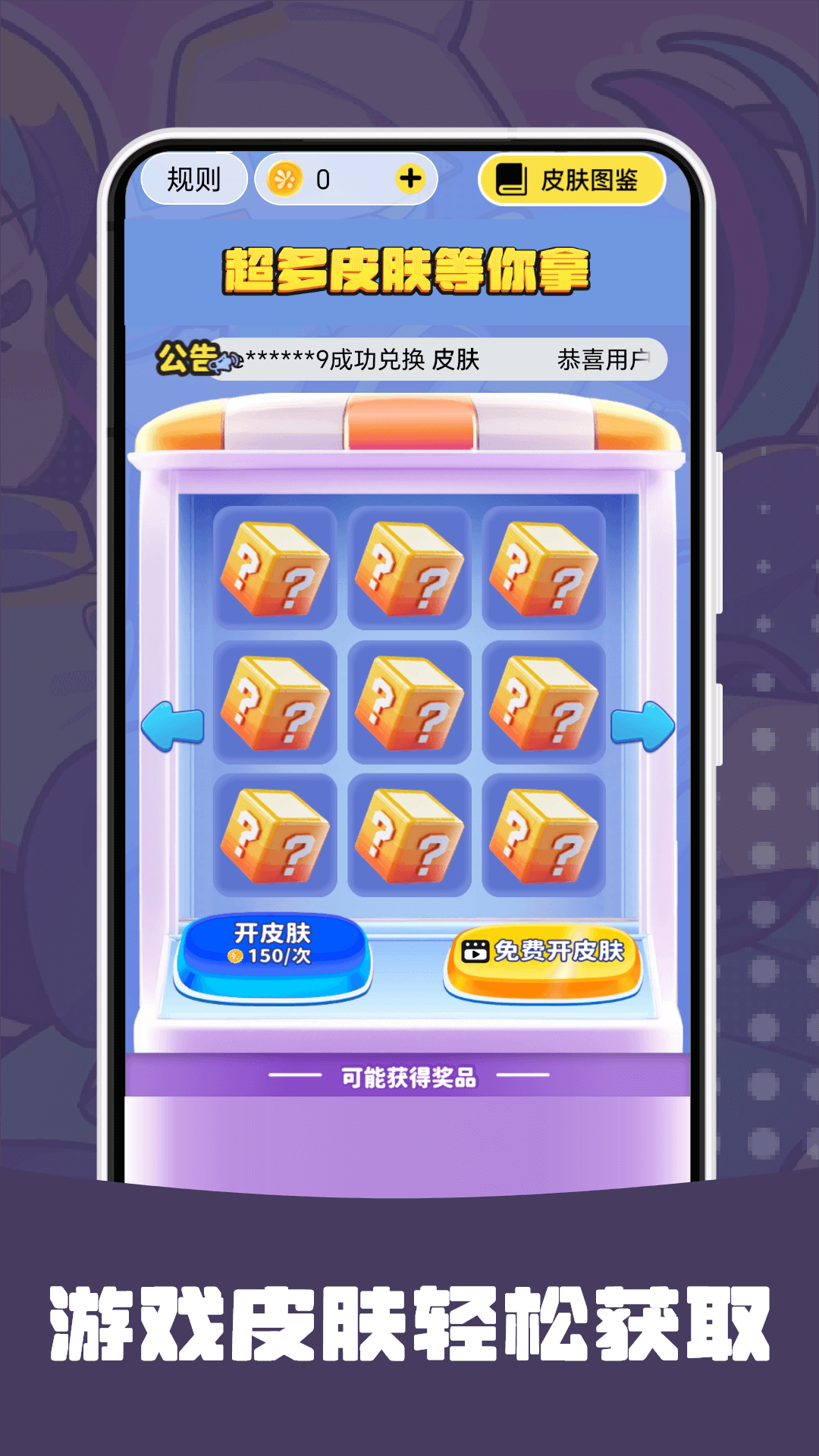 是一款给游戏爱好者免费领皮肤的软件,支持市面上热门的游戏,根据不同皮肤等级进行兑换!<br>简单易用,简单的操作就可以进入兑换环节,勾选对应的选项,进行相关的操作。<br>支持多款网游在线领取皮肤,喜欢游戏的玩家快来下载试试吧!