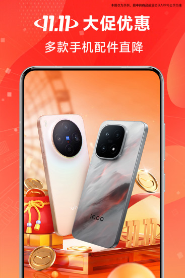 11.11大促优惠 多款手机配件直降! 国家补贴享85折,至高补贴500元! vivo官方平台,正品保障,为您提供vivo、iQOO手机及配件、智能硬件等产品。 在vivo商城,可以了解新产品信息,查询附近的vivo门店,享受全国联保、7天无理由退换货、手机定制等优质服务。 【超值福利】 国家补贴:享85折,至高补贴500元 新品首发:vivo X Fold5,X300系列,S30系列、iQOO15系列,iQOO Neo10系列新品首发,抢购快人一步! 新人优惠:专属新人礼包,包含手机和配件! 价格直降:多款vivo、iQOO手机和配件价格直降! 抢购频道:精选好物,享5折秒杀。 vivo社区:v粉、酷客交流互动,新品评测,有奖问答福利多! 【优质服务】 手机镭雕定制,免费定制专属新机; 手机优先顺丰发货,7天无理由退货,30天换货,全国联保。 V粉好评如潮: @养***户:手机收到,用了一段时间,打游戏非常顺畅,画质清晰! @英***彩:昨天下单,今天早上就收到了,手机颜值很高~ @盟**的:系统流畅,电池很耐用,爱了 【联系我们】 官方微博:@vivo官方商城 官方微信: