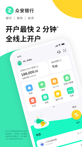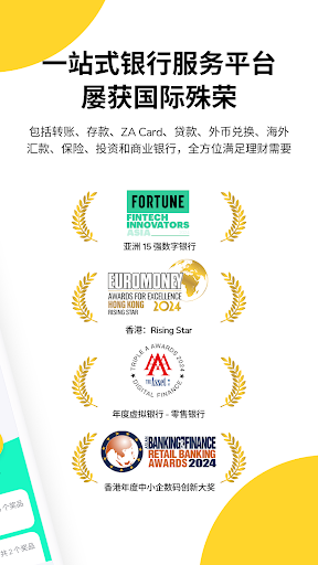 ZA Bank 是受监管的香港持牌银行,更是香港第一间开业的数字银行。ZA Bank 致力打造一站式的银行服务平台,包括转账、存款、ZA Card、贷款、外币兑换、海外汇款、保险、股票 、基金等投资服务都能一 App 完成,同时提供获业界权威奖项认可的商业银行网上平台!<br><br>体验与众不同的银行服务 <br><br>ZA Card - 香港第一张由你自订卡号的 Visa 扣账卡 <br>全港首创自订卡号的 Visa 扣账卡(debit card),真正与「众」不同。更可申请实体卡!实体 ZA Card 上无 CVV 及到期日,减少被盗用的风险。<br><br>年中无休,最快 2 分钟*开立 ZA Bank 账户 - 真正 24 x 7 全线上银行,助你随时随地轻松处理所有银行服务!<br><br>更多关于 ZA Bank 的服务及产品介绍可浏览 bank.za.group。 <br>*开立户口所需的时间取决于实际情况而定。一般而言,在无需提交额外资料的情况下,用户最快可于 2 分钟内完成户口开立。<br><br>此外,为提升互动体验,当你在 ZA Bank App 参与推广活动、互动游戏或使用相关功能时,我们可能从你的装置收集以下数据:仅限「读取步数」数据。<br><br>iOS 端在你登入并授权后,会从 Apple Health(HealthKit)或「Motion & Fitness(动作与健身)」同步步数,其数据源可能包括 iPhone、Apple Watch、兼容的穿戴式装置,或已接驳至 Apple Health 的应用程序。<br>Android 端在你登入并授权后,会从你选择的应用(如 Health Connect)同步步数;你可将穿戴式/健身装置连接至该应用以进行同步。<br><br>最小权限及用户控制权:我们仅会申请「读取步数」的必要权限,不会读取心率、睡眠、位置等其他健康数据。你可随时于装置设定/健康平台撤回或调整授权,亦可在 App 内关闭相关功能。若你未授权或已撤回授权,步数将不会再被同步,部分互动活动功能可能因此受限,但这不会影响你使用 ZA Bank 的任何核心银行功能。我们仅将步数数据用于上述互动体验功能,不会用于个人化广告推送,并采用业界标准的保安措施保护。详情请参阅《私隐政策》。<br> <br>本银行移动应用程式(「应用程式」)由众安银行有限公司(「ZA Bank」)提供,仅供现有 ZA Bank 的客户或持有有效身份证明文件并在提供居住地址的人士使用 (「客户」)。 如果你没有有效的身份证明文件和居住地址,或者(如你位于香港境外)你不是现有的 ZA Bank 客户,则不要下载此应用程式。 本应用程式及其提供的信息不供任何司法管辖区的任何人下载或使用,因为法律或法规不允许此类下载或使用。 任何非客户下载和/或使用本应用程式,将豁免 ZA Bank 因非客户任何不当行为或不遵守此适用的程式和指示引起的任何责任赔偿,损害,损失,支出或费用。 <br><br>ZA Bank 在任何其他司法管辖区无权或授权提供通过本应用程式提供的产品和/或服务,也不声明或保证本应用程式的内容适合或可供香港境外使用。 你有责任找出这些限制并遵守这些限制。 在使用本应用程式或我们的服务之前,请确保你遵守适用于你的当地法律和法规。 <br><br>本应用程式不应视为传达任何邀请或诱使从事银行或贷款,或任何要约或招揽向任何不合法的任何人提供此类要约或招揽,或当地法律或法规不允许此类活动或使用此类产品或服务。 通过本应用程式申请任何产品和/或服务,即表示你声明并确认你遵守适用于你使用本应用程式或我们服务的当地法律和法规。