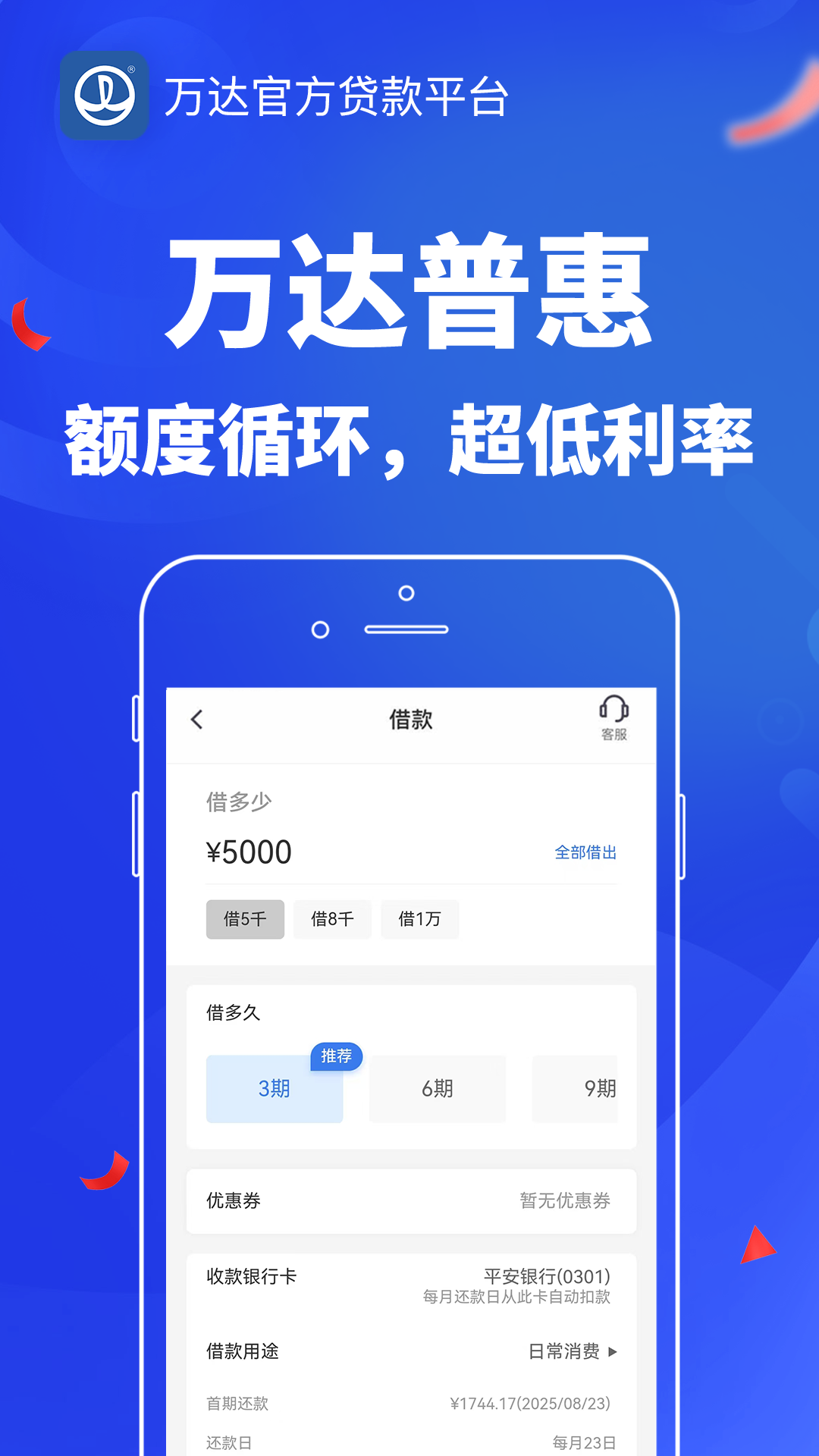 万达普惠APP是由万达集团面向中小微企业、个人消费者提供的“移动贷款”解决方案,从此资金不愁,快乐逐梦! 贷款申请、审批、提款、归还,一站式解决 我们的优势 【轻松申请】您可随时随地在线申请贷款,无需提供任何纸质材料。 【快速审批】仅需几分钟即可获批贷款额度,无任何额外费用。 【利率合规】年化利率9%~24%,符合相关法律法规。 【随用随提】可根据您的实际用款需要,分多次提款,不提款绝不会产生任何费用,敬请放心使用。 【还款灵活】多种还款方式供您选择,轻松还款毫无压力。