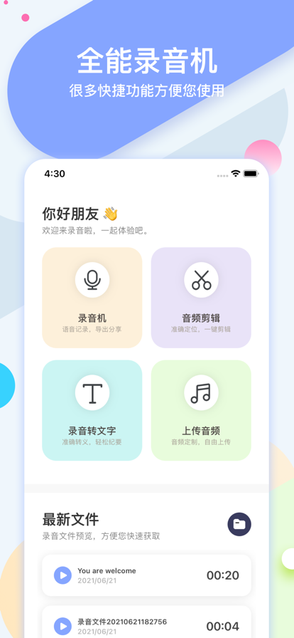 「 录音啦 」 一款“简单”的app让你的工作和学习变得更简单!无论你是打工人还是学生党,无论是你是要记录生活的重要时刻还是想增加你的工作效率,这款产品都非常适合你! 你还在为做会议记录而苦恼吗?你还在为整理采访稿子而忧愁吗?你还在为上课开小差错过重点而后悔?满足你在不同场景下的录音需求~ 「功能热点」 随便录: 支持自动录音,后台录音,随时随地想录就录! 随便听: 可生成播放列表,自定义播放,调节播放速度。 随便搞: 音频剪辑功能,可以录音后直接剪辑或者上传录好的音频进行剪辑,支持多段选择、拆分、合并、变速、等功能灵活方便。 支持多种音频格式转换,如:MP3、M4A、AAC、WAV等格式。 语音转文字,可以将音频直接转换成文字,一边听一边看! 智能配音,可以把文字转换成语音,调整语速和音调。 分享和保存:一键分享或保存,如微信、QQ、邮件、iCloud、百度网盘、文件共享等! 「联系我们」 如果您在使用过程中有任何宝贵意见,都可以反馈给我们!诚邀您与我们一起让小熊录音变得更好! 「应用程序订阅」 您可以订阅以获得访问所有小熊录音功能的权限。 一旦购买确认后,款项将直接从iTunes账号扣除 订阅期间您可以使用所有的操作面板,所有码库,和为期一年的更新内容 订阅会自动续期同之前的价格和期间(一年),除非在当前订阅期结束前至少提前24小时关闭自动续期 当前订阅期结束前的24小时内会根据您选择的期间(每年)从账号扣除续期费用 购买后,用户可在账号设置中管理订阅和关闭自动续期。 在有效订阅期间,无法取消当前订阅 "您可以透过iTune账户的订阅设置在免费试用期间来取消订阅。 请务必在订阅结束前24小时完成,以避免被收取费用。更多讯息請至:http://support.apple.com/kb/ht4098 " 您可以通过iTunes账号设置来关闭自动续期。无认如何您无法在有效订阅期间取消目前订阅。 免费试用期间任何未使用的部分将在购买会员订阅后作废。 服务条款和隐私政策請至以下连结: 隐私政策: https://dzperfect.coding.net/s/05cb9e6b-4bdc-440e-8755-18b11be6da92 服务条款: https://dzperfect.coding.net/s/3b6823fe-918c-4e09-a93f-7f152a41c214 价格等于《Apple的App Store定价表》规定的以美元计的订阅价格。
