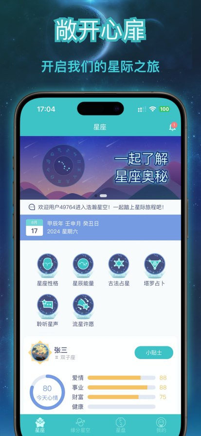 今日星座APP分析您的每日星座运势、星座的性格、人际关系和优缺点,并且可以根据两个星座相互磁场的影响,给到您专业的运势、恋爱指导。 【每日星历】 日历查看,阳历、农历、干支、星座、属相查看。 【聆听星声】 优秀助眠、冥想曲推荐。 【塔罗占卜】 让你拨开眼前的迷雾,找到答案。 【星盘奥秘】 免费星盘十二宫查询,提供个人星盘详细分析数据,让您更加了解自己的星盘属性。 【十二星座运势解析】 定制的每日、整年的事业、爱情、健康、财富等运势。 【十二星座的解析】 详细的分析十二星座的性格、人际关系、优缺点。 【缘分星空】 根据星座结合相互之间的磁场,给出详细的关系详解。 【感悟星辰】 以北斗七星的磁场影响,对其的感悟分析出最近一段时间内,这股能量对人会产生怎样的情绪影响,给出对应的知道建议。 【流星许愿】 用户可以通过向流星许愿,把自己内心的小秘密分享出来。让其他有缘的用户可以浏览到,给予情感上的安慰。