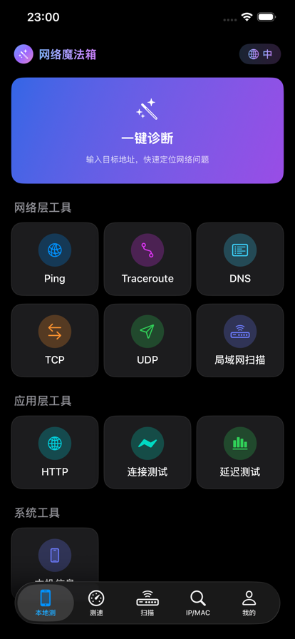 专为网络工程师、运维人员、开发者及技术爱好者打造的移动端网络诊断工具箱,支持IPv6。无论是排查网络故障、测试服务器连通性,还是分析网络性能,网络魔法箱 都能助您一臂之力。 【一键诊断】 输入目标地址,自动执行 Ping、TCP、DNS、Traceroute 等多项诊断任务,快速定位网络问题,高效排障。 【网络层工具】 • Ping:测试网络延迟与连通性,支持自定义包大小、发送间隔 • Traceroute:追踪数据包路由路径,显示每跳延迟、丢包率及 IP 归属地 • DNS 查询:支持 A、AAAA、CNAME、MX、TXT、NS 六种记录类型 • TCP 端口测试:单端口连接或批量扫描常用端口,快速检测服务状态 • UDP 测试:发送 UDP 数据包并检测响应,适用于 DNS、NTP 等服务 • 局域网扫描:一键探测内网所有在线设备,显示设备 IP/MAC 地址,识别设备类型,排查内网地址冲突、设备连接异常问题 【应用层工具】 • HTTP GET:发送 HTTP 请求,查看状态码、响应头、响应体及响应时间 • 连通性测试:批量检测多个目标的网络连通性 • 延迟测试:测试常用应用和服务的访问延迟 【系统工具】 • 设备信息:查看公网 IP 及归属地、设备型号、系统版本、网络状态 • 抓包:网络数据包捕获分析(开发中) 【测速】 独立 Tab 页,测试下载/上传速度、网络延迟及抖动,同时检测微信、腾讯视频、百度等常用应用的访问延迟 【IP 查询】 独立 Tab 页,支持 IPv4/IPv6 地址归属地查询,快速获取国家、省份、城市、运营商信息,保存历史查询记录 【MAC 查询】 独立 Tab 页,支持查询MAC地址归属厂商 【历史记录】 自动保存所有测试任务记录,支持按类型筛选、查看详情,14 天自动清理 【更多特性】 • 支持 IPv4/IPv6 双栈 • 中英双语切换 • 安装包仅 5MB,轻量便携 • 本地测试离线可用 • 深色模式适配 本应用使用 Apple 标准最终用户许可协议(EULA):https://www.apple.com/legal/internet-services/itunes/dev/stdeula/
