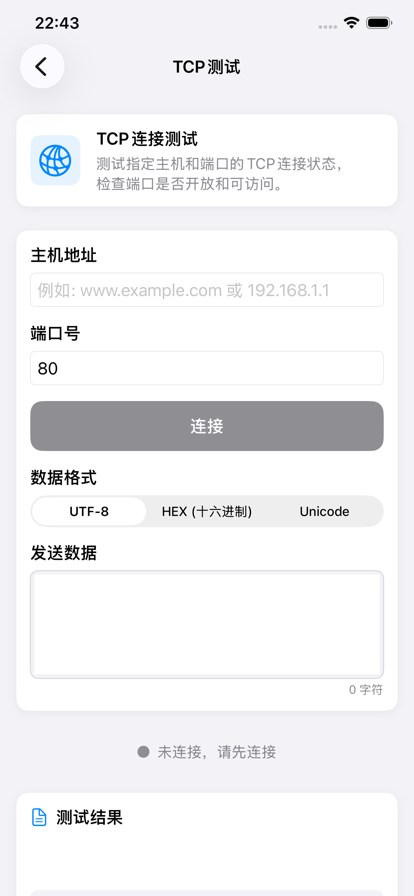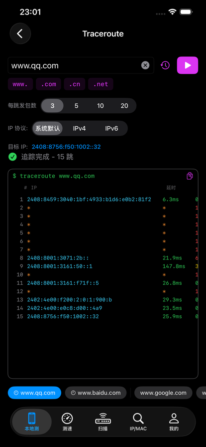 网络测试工具 - 您的专业网络诊断助手 网络测试工具是一款专为iOS设备设计的网络诊断应用,集成了Ping、TCP、UDP和Traceroute等核心网络测试功能,帮助您快速、准确地诊断和分析网络问题。 为什么选择网络测试工具? 【功能全面】 集成网络工程师最常用的测试工具,一个应用解决多种网络诊断需求。无需切换多个工具,提高工作效率。 【操作简单】 直观的用户界面设计,即使是非专业人员也能轻松使用。输入目标地址,选择测试类型,一键即可获得详细结果。 【结果详细】 提供完整的测试报告,包括响应时间、丢包率、路由路径等关键信息,帮助您全面了解网络状况。 【性能优异】 优化的算法设计,确保测试快速执行,即时反馈结果,节省您宝贵的时间。 【安全可靠】 所有测试在本地执行,不收集用户数据,保护您的隐私安全。 适用场景 • 开发调试:测试API接口连通性,验证服务器配置 • 故障排查:快速定位网络问题,诊断连接故障 • 性能优化:评估网络延迟,优化应用性能 • 运维监控:定期检查服务器状态,保障服务稳定 • 学习研究:深入了解网络协议,学习网络知识